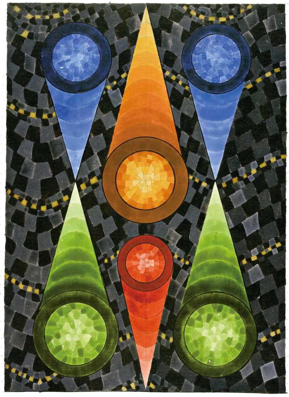 [3] 頂部題字:“愛的征服”。底部題字:“這幅圖完成於1921年1月9日,一直持續9個月才畫完。它表現的是某種說不出的悲傷,一種四位一體的獻祭。我差點沒有選擇不去畫完它。這是不可阻擋的四功能之輪,是所有活體灌注在祭品上的精華。”四種功能分別是思維、情感、感覺和直覺,榮格在《心理類型》(1921)寫到這些。1920年2月23日,榮格在《黑書7》中寫道:“在愛人和被愛的人之間充滿神性,但彼此都是對方的難解之謎。那麼誰能夠理解神性?/但神生而孤獨,源自個體的/神祕。生命和愛之間的分離來自孤獨和親密無間的衝突。”(88頁)。《黑書7》在1921年9月5日才繼續往下寫。1920年3月4日,榮格和自己的好朋友赫爾曼·希格到北非旅行,4月17日纔回來。