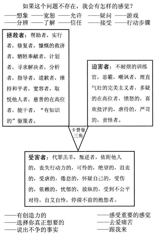 在所有挑战中,“受害者监牢”的三个层面都会存在。人们会扮演你戏剧三角形中的角色,这反映出由你的心智所创造的陷阱。有时候你会扮演迫害者,用理直气壮的愤怒来攻击伴侣。有时候你会分饰拯救者和迫害者两角,试着用“野蛮的爱”把你的受害者伴侣从困境中解救出来。或者你也可能扮演拯救者,尽一切力量去鼓舞你的受害者伴侣。有时候你会变成受害者,向你的拯救者伴侣求救,但伴侣突然失去了耐心,转换成迫害者的角色。还有些时候,你扮演的受害者会一面求救,一面却又拒绝接受帮助。[20]