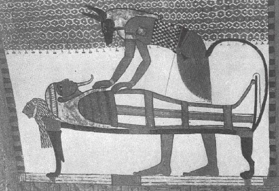 圖44 生着胡狼頭的冥神阿努比斯(Anubis)俯身於木乃伊之上