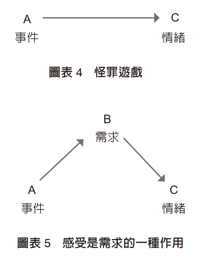 我們的思想和語言有能力塑造我們的經歷。爲自己的感受負責,並讓自己從指責中解脫出來,需要敏銳關注產生和強化怪罪遊戲的感知機制。下頁圖說明了怪罪遊戲背後的邏輯。一個朋友跟你相約,卻遲到十五分鐘,你說:「你的遲到讓我很生氣。」這真的是一種直接的因果關係嗎?真的是他們的行爲引發你的情緒嗎?
