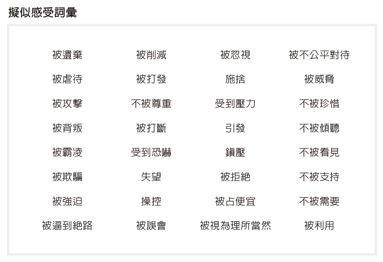 有很多詞彙都屬於「擬似感受」的範疇,也就是說,藉由指責他人來表達情緒。在下表中,你會用哪一個來表達情緒?在用這個詞的時候,你心裏有什麼感覺?