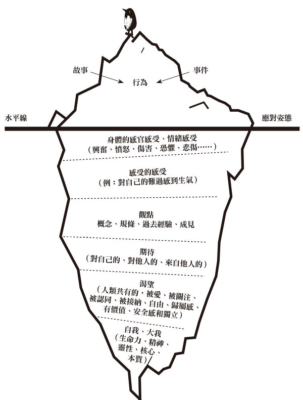 當時雖然我已經深刻感受到這股巨大能量,但一開始我並不能駕馭,反倒常被這股能量所控制;經常熱情過頭、活力浪擲、反應過度,隨之而來的就是一直處在亢奮、過激和慣性的應對狀態。直到我認識推廣薩提爾的李崇建老師——這也應該列入開放教室之後帶來的新資源和機會,不然我們就不會有機會在海內外對談時而結識——並在崇建的協助和指導下,逐漸深入薩提爾模式和冰山理論,終於能夠完整看清楚,原本一直看不見的、隱藏在冰山底層下的,關於感受、觀點、期待、渴望和自我。至於怎樣看清楚,看清楚了什麼,後來會發生什麼變化,我都完整寫在這本書裡了。