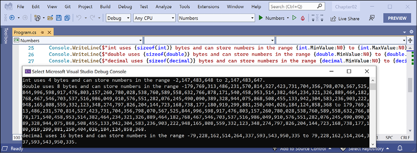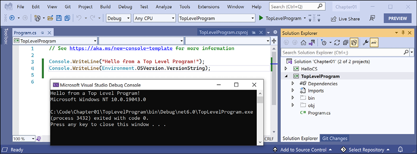 Chapter 1, Hello, C#! Welcome, .NET!, is about setting up your development environment and using either Visual Studio or Visual Studio Code to create the simplest application possible with C# and .NET. For simplified console apps, you will see the use of the top-level program feature introduced in C# 9. For learning how to write simple language constructs and library features, you will see the use of .NET Interactive Notebooks. You will also learn about some good places to look for help and ways to contact me to get help with an issue or give me feedback to improve the book and future editions through its GitHub repository.
