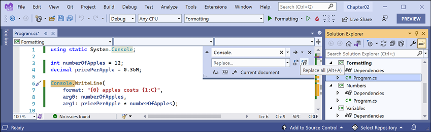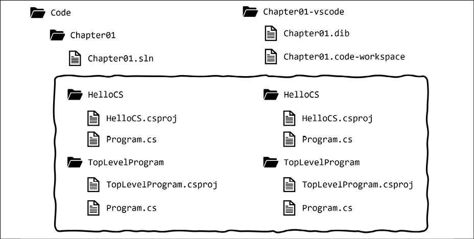 In the third edition of this book, I gave detailed step-by-step instructions for both Visual Studio for Windows and Visual Studio Code for all coding tasks. Unfortunately, that got messy and confusing quickly. In this sixth edition, I give detailed step-by-step instructions for how to create multiple projects in both Visual Studio 2022 for Windows and Visual Studio Code only in Chapter 1. After that, I give names of projects and general instructions that work with all tools so you can use whichever tool you prefer.