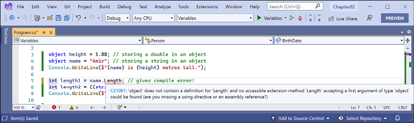 Chapter 2, Speaking C#, introduces the versions of C# and has tables showing which versions introduced new features. I explain the grammar and vocabulary that you will use every day to write the source code for your applications. In particular, you will learn how to declare and work with variables of different types.