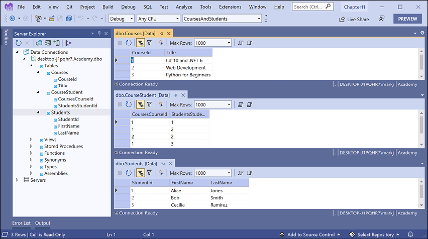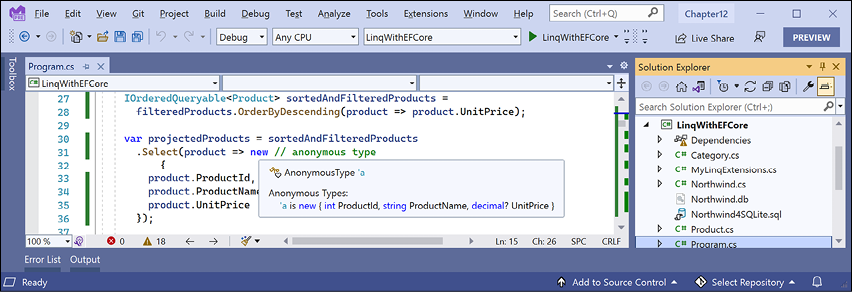 Chapter 10, Working with Data Using Entity Framework Core, explains reading and writing to relational databases, such as Microsoft SQL Server and SQLite, using the object-relational mapping (ORM) technology named Entity Framework Core (EF Core). You will learn how to define entity models that map to existing tables in a database, as well as how to define Code First models that can create the tables and database at runtime.