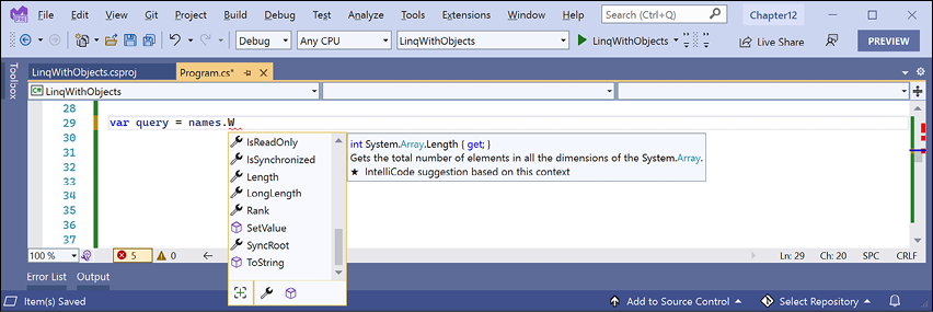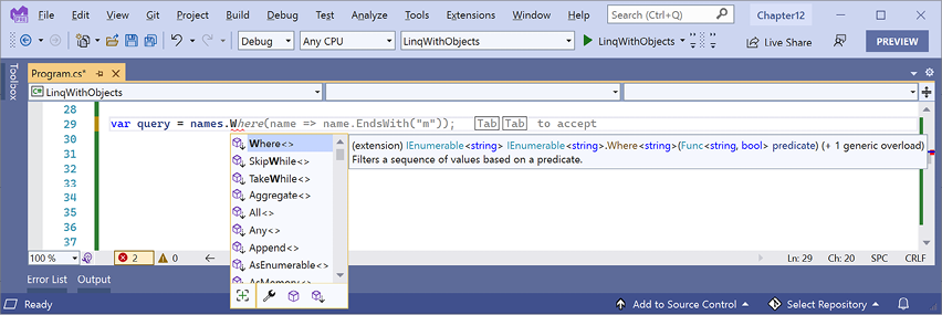 Chapter 11, Querying and Manipulating Data Using LINQ, teaches you about Language INtegrated Queries (LINQs)—language extensions that add the ability to work with sequences of items and filter, sort, and project them into different outputs. You will learn about the special capabilities of Parallel LINQ (PLINQ) and LINQ to XML.