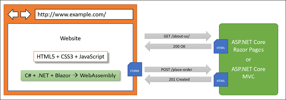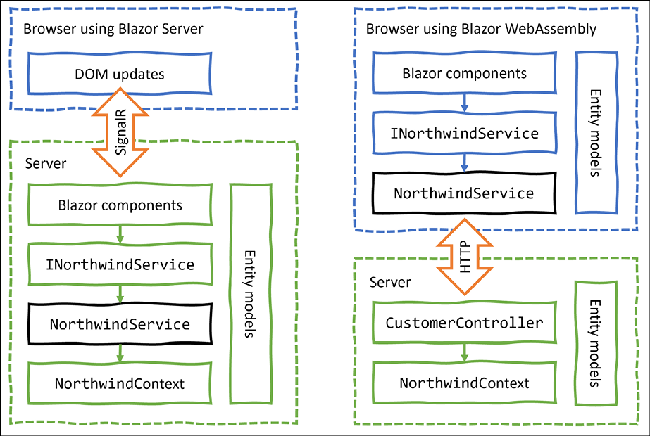 Chapter 17, Building User Interfaces Using Blazor, introduces how to build web user interface components using Blazor that can be executed either on the server side or inside the client-side web browser. You will see the differences between Blazor Server and Blazor WebAssembly and how to build components that are easier to switch between the two hosting models.
