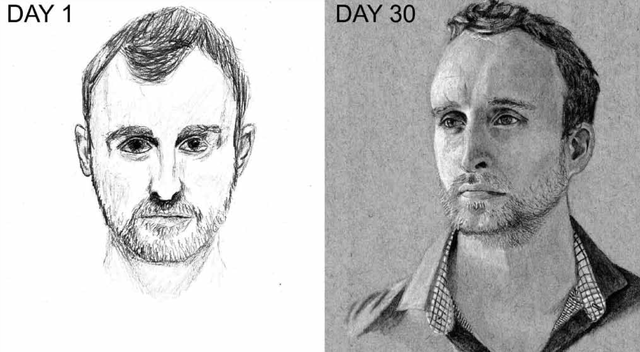 這計劃較短,我花了一個月與總共一百小時練習。除了速寫畫,以及把圖紙鋪在參考照片上直接比較的快速回饋策略之外,我也從《像藝術家一樣思考》這本書與維特魯威工作室的人像繪畫課中獲益良多。