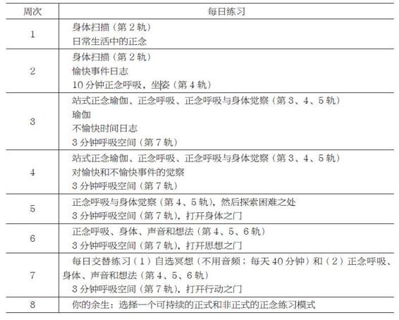 當我們通過8周正念課程來引導病人時,發現很重要的一點是我們會在每次課程之前提醒自己本次課程的更大「日程」。同樣的道理,我們推薦你每週開始時也去回顧本書的相關章節。為了幫助你這樣做,我們在這裡概括課程的每一週的推薦項目,並且在最開始就強調它們。現在是合適的時機去整合每一章中描述的額外練習了,如果你之前並沒有這樣做的話。