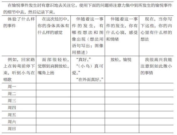第二週的非正式練習,我們建議你延伸正念到每日的活動中,添加一項新的你每天會做的日常活動,在這一活動中特別去保持存在和關注,還有做你第一週選定的活動。嘗試每天覺察生活裡一件愉悅的事,就在它正在發生的時候,這也是一個很好的主意。為這一週保持一個日曆表(見表11-2),簡略體驗的內容,在發生的時候你是否真覺察到它了(任務雖然是這樣,但有時候並不會真地這樣發生),當時你的身體有何感受,出現了什麼想法和感受,在你記錄的時候有什麼想法經過了你的腦海。