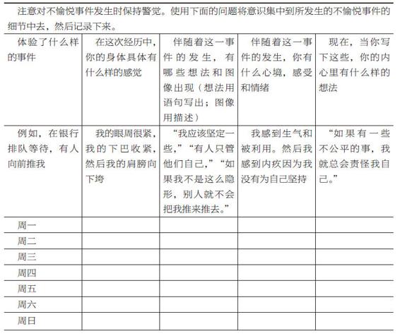 第三週的非正式練習是,每天試著去詳細地覺察你在一件不愉悅或有壓力的事情上的體驗。觀察並記錄這些不愉悅的事件,就像你在第二週中的愉悅事件之中所做的一樣。表11-3提供了一個示例的日曆表。