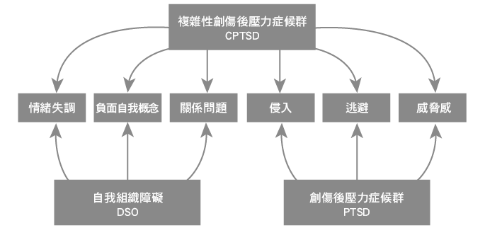 3. 除了涵蓋全數PTSD的診斷標準外,CPTSD的概念亦兼具嚴重且持續的情緒調節、負面自我概念、關係困難等自我組織障礙。