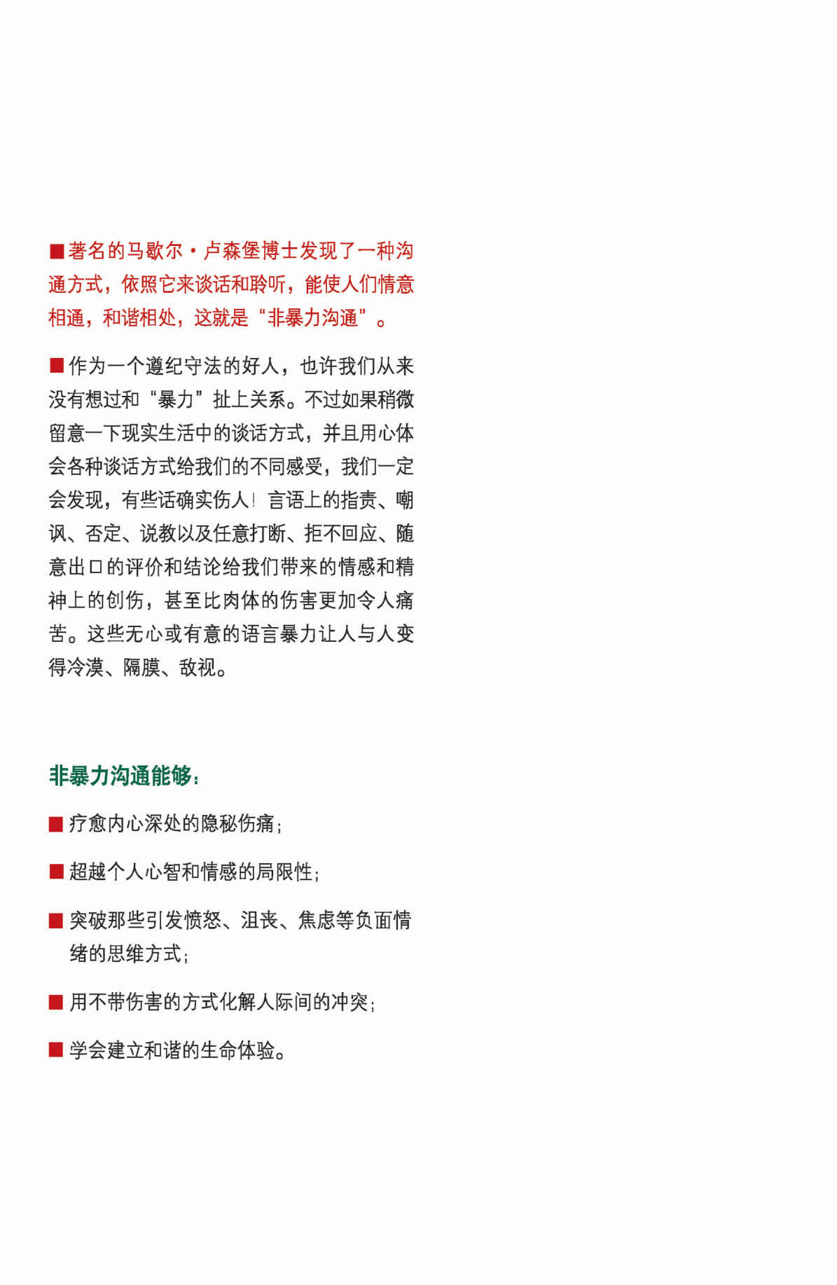 非暴力溝通指導我們轉變談話和聆聽的方式。我們不再條件反射式地反應,而是去明瞭自己的觀察、感受和願望,有意識地使用語言。我們既誠實、清晰地表達自己,又尊重與傾聽他人。這樣,在每一次互動中,我們都能聆聽到自己和他人心靈深處的呼聲。同時,它還促使我們仔細觀察,發現正影響我們的行為和事件,並提出明確的請求。它的方式雖然簡明,但能帶來根本性的變化。