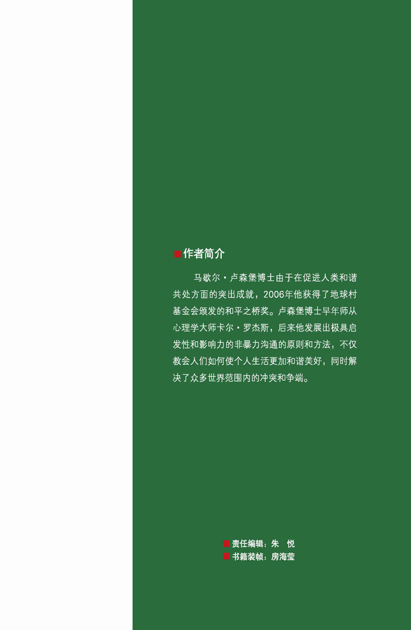 人們常說:“愛能使心靈的創傷痊癒。”我深信,愛的能力取決於審美能力。我衷心祝願,《非暴力溝通》中文版的出版能夠有助於我們發現生命的美與力量,不僅使我們內心的創傷痊癒,而且還能使我們人際關係中的創傷痊癒。