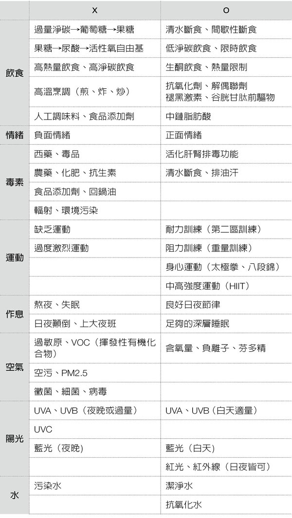 換言之,只要我們離開大自然的規律,粒線體就會開始退化。本書最後,我做了一個表格(見本章最後),總結一下,粒線體會被什麼因素影響。