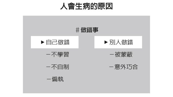 人為什麼會生病?這個問題我想了50年,我認為生病的原因就是「做錯事」,所以我的第一本書書名就叫做《 吃錯了,當然會生病》,如果我們不清楚生病的原因,就很難去逆轉。但我要強調一下,這個「做錯事」,有可能是自己做錯,也有可能是別人做錯。