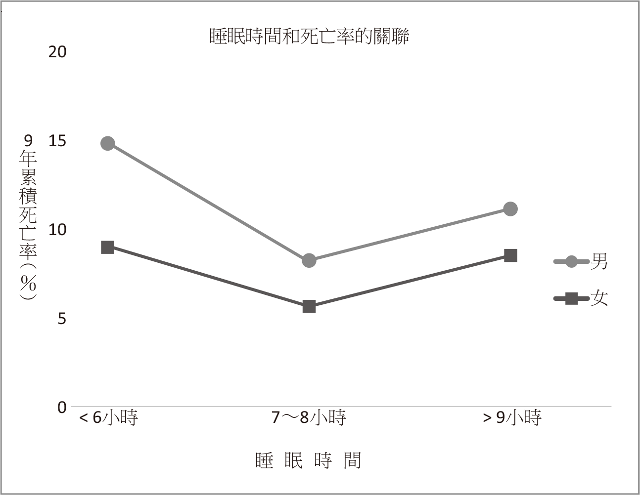 就像右頁這張圖所顯示的,無論男女,睡眠時間在7~8小時的組,9年累積死亡率是最低。然而,如果睡不到6小時,死亡率就提高了。