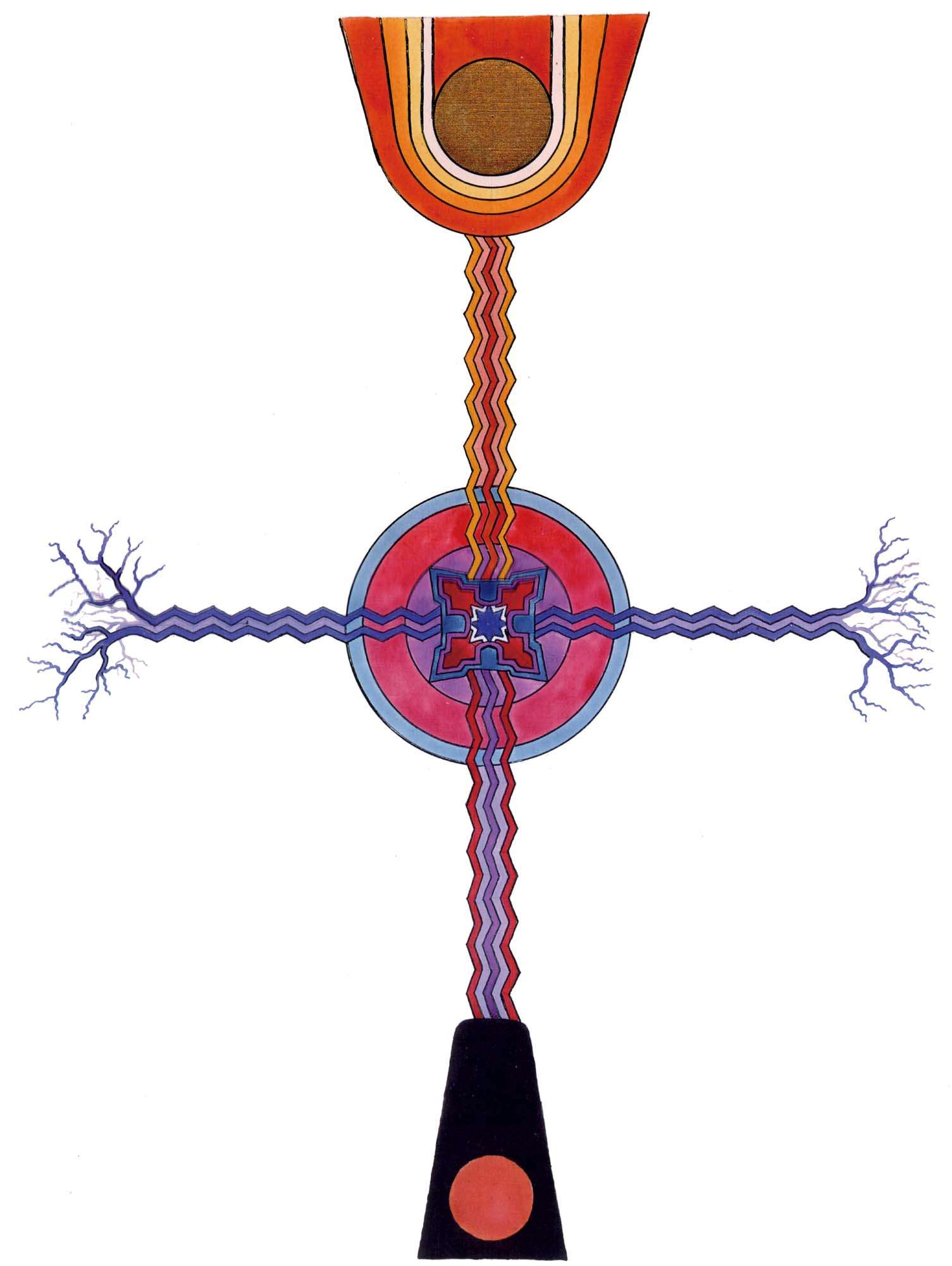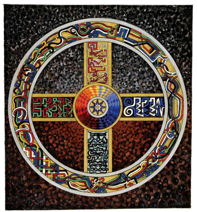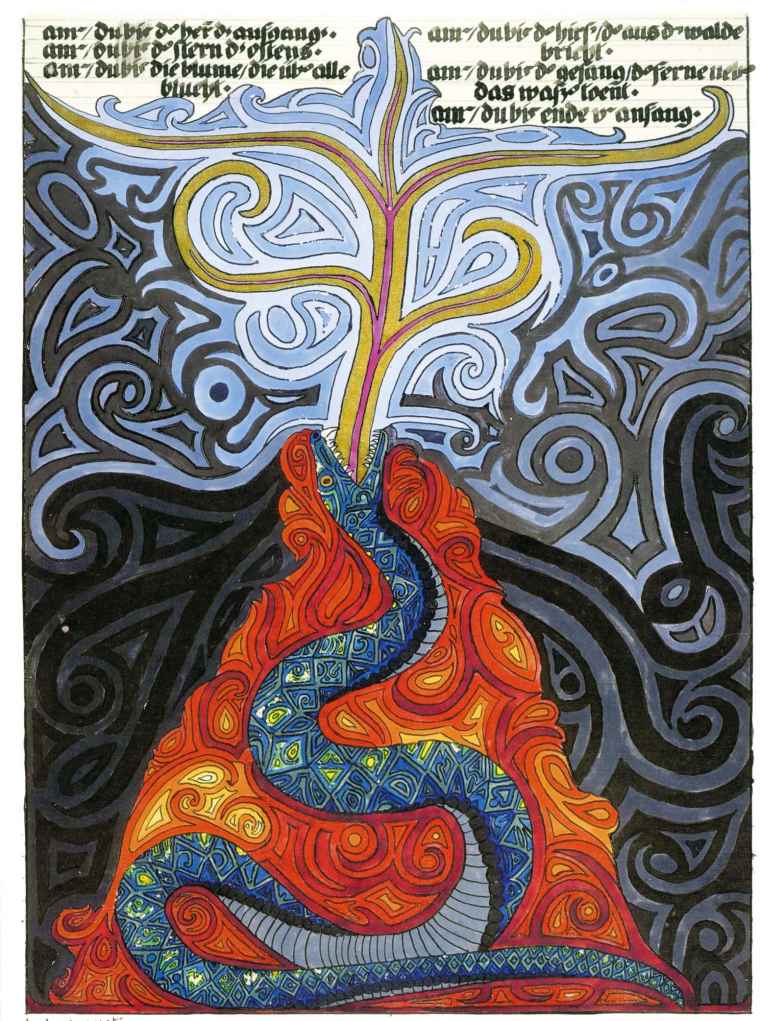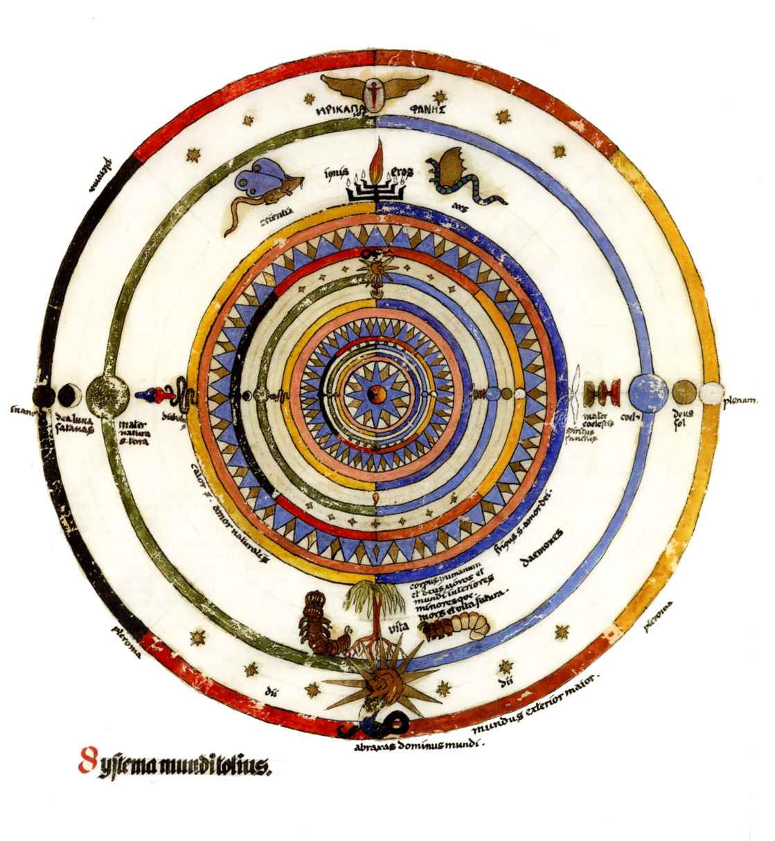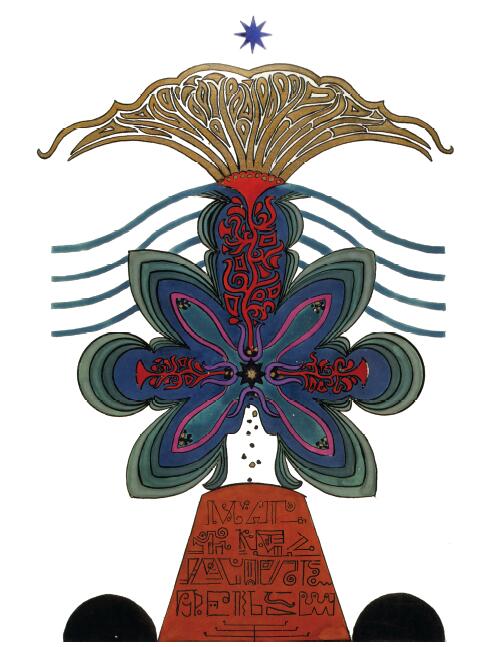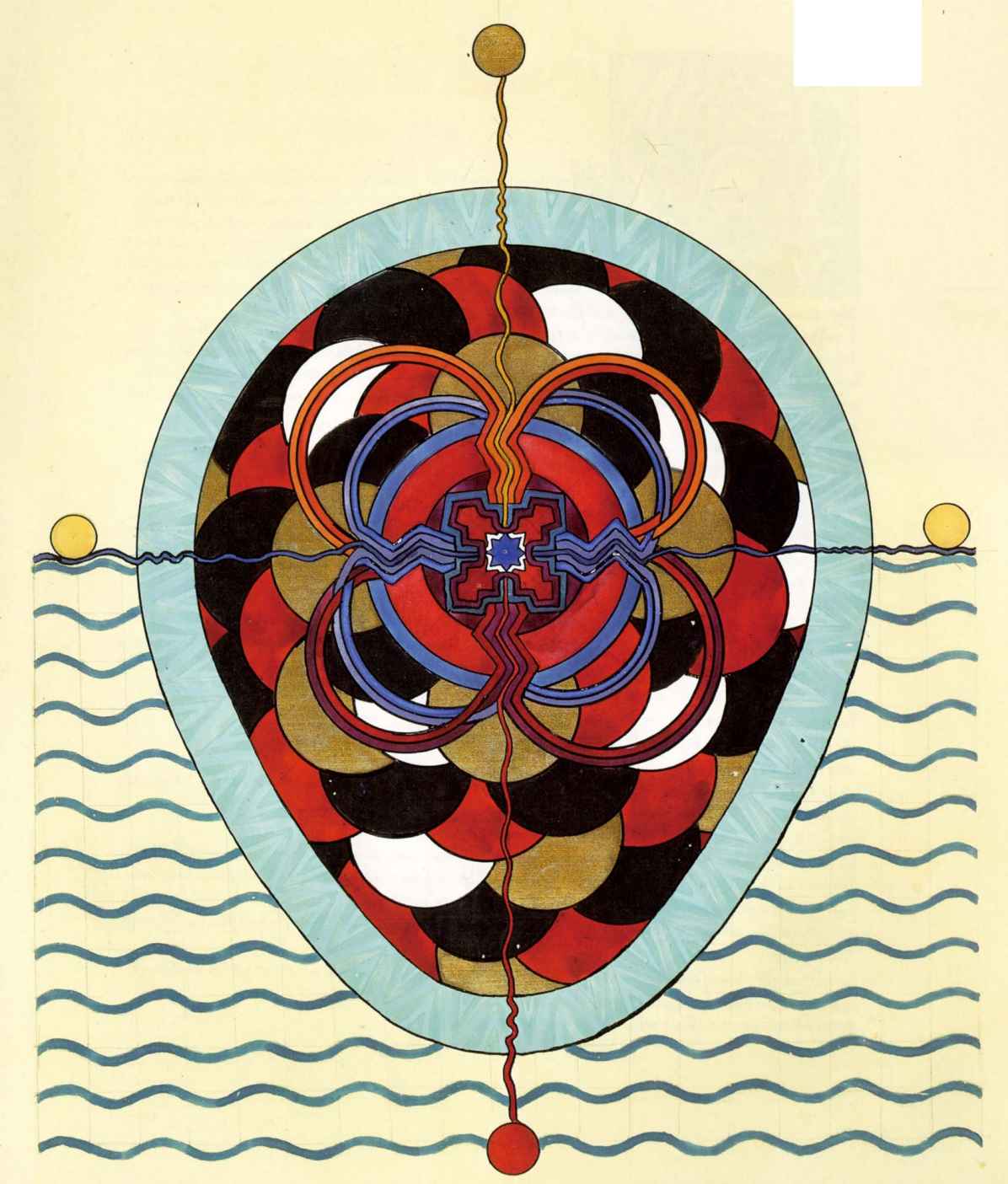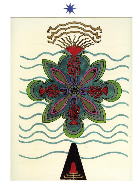 普天大系。(30釐米×34釐米)1955年,榮格的“普天大系”以匿名的形式發表在雜誌《你(Du)》的艾諾斯會議特刊中。1955年2月11日,榮格在寫給瓦爾特·科爾蒂的信中詳細說明他不願意自己的名字出現在這幅圖上(榮格藏品)。他補充以下評論:“它描繪的是宏觀世界中微觀的二律背反和其自身的二律背反。最上方長著翅膀的蛋中的男孩叫艾瑞卡派奧斯(Erikapaios)或法涅斯,使人聯想到俄耳甫斯神的精靈形象。在底部與之相對應的黑色部分是阿布拉克薩斯,他代表的是世界的主宰(dominus mundi),現實世界之主,是矛盾本質的創世者。我們看到生命之樹在這裡發芽,標有vita(生命),而上端相對應的部分是一棵發光的樹,這棵樹像一個有七條分叉的燭臺,寫有ignis(火)和Eros(愛)。燭光指向聖童的精神世界,藝術和科學也屬於這個精神領域,長著翅膀的蛇象徵代表第一個,長著翅膀的老鼠代表第二個(像挖洞活動!)。燭臺是基於神聖數字三的原則(小火焰是三的兩倍和中間的大火焰),而底部的阿布拉克薩斯的世界的特徵是五,這是自然人的數字(他的星星的光線是五的兩倍)。與自然世界一起的動物是邪惡的怪物和一條幼蟲,代表死亡和重生。曼陀羅另一種是水平對應。在左側,我們看到一個環,代表身體或血液,有一條盤在菲勒斯上的蛇,這是繁殖原則。蛇是黑暗和光明,代表地球、月亮和宇宙空間的黑暗世界(因此被稱為撒旦(Satanas)。富饒充滿光明的世界在右側,這裡來自明亮的環frigus sive amor dei(冰冷,或神的愛),聖靈的鴿子張開翅膀,智慧(Sophia)從雙重杯中向左右兩側灑開,這個陰性的環是天,有鋸齒線或射線的大環象徵內在的太陽,其內部是宏觀世界的重複,但在較高和較低的區域像在鏡子中一樣被反轉。這些重複應該被視為無盡的數字,變得越來越小直到最核心處,抵達真正的微觀。”版權所有