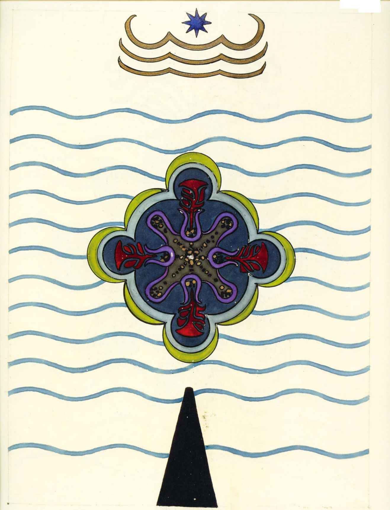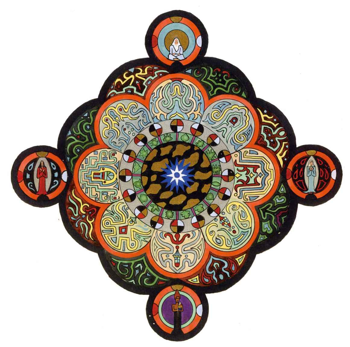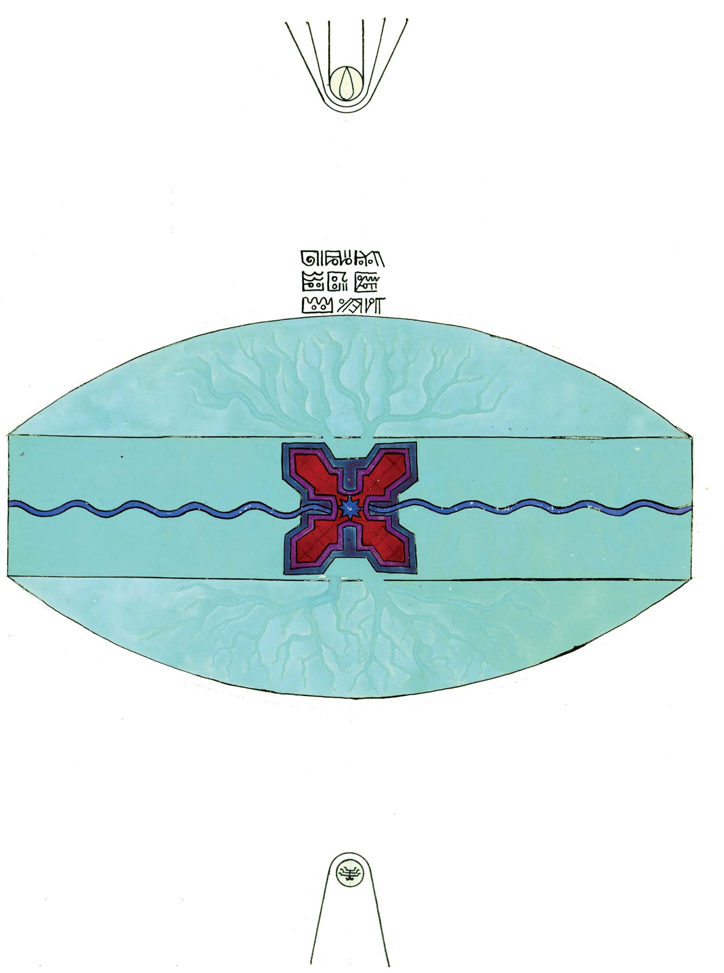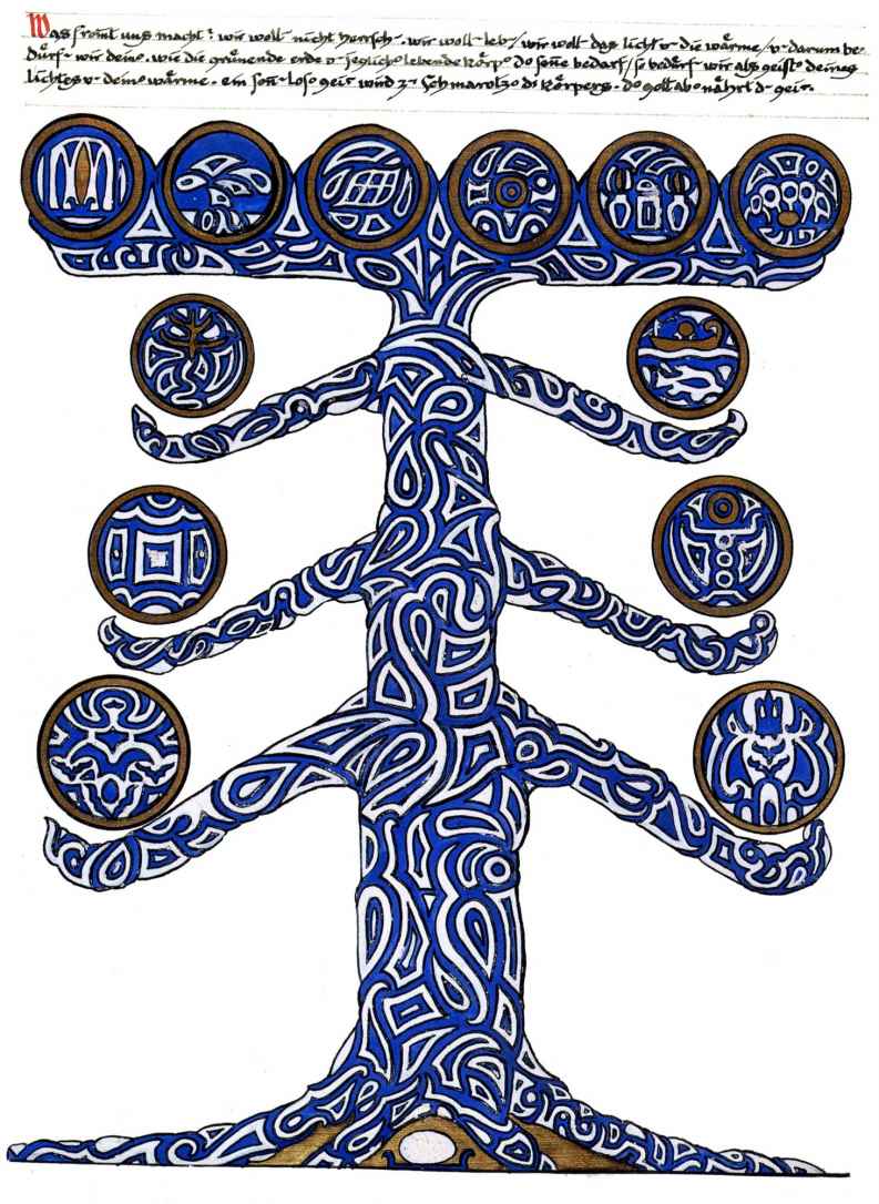 普天大系。(30釐米×34釐米)1955年,榮格的“普天大系”以匿名的形式發表在雜誌《你(Du)》的艾諾斯會議特刊中。1955年2月11日,榮格在寫給瓦爾特·科爾蒂的信中詳細說明他不願意自己的名字出現在這幅圖上(榮格藏品)。他補充以下評論:“它描繪的是宏觀世界中微觀的二律背反和其自身的二律背反。最上方長著翅膀的蛋中的男孩叫艾瑞卡派奧斯(Erikapaios)或法涅斯,使人聯想到俄耳甫斯神的精靈形象。在底部與之相對應的黑色部分是阿布拉克薩斯,他代表的是世界的主宰(dominus mundi),現實世界之主,是矛盾本質的創世者。我們看到生命之樹在這裡發芽,標有vita(生命),而上端相對應的部分是一棵發光的樹,這棵樹像一個有七條分叉的燭臺,寫有ignis(火)和Eros(愛)。燭光指向聖童的精神世界,藝術和科學也屬於這個精神領域,長著翅膀的蛇象徵代表第一個,長著翅膀的老鼠代表第二個(像挖洞活動!)。燭臺是基於神聖數字三的原則(小火焰是三的兩倍和中間的大火焰),而底部的阿布拉克薩斯的世界的特徵是五,這是自然人的數字(他的星星的光線是五的兩倍)。與自然世界一起的動物是邪惡的怪物和一條幼蟲,代表死亡和重生。曼陀羅另一種是水平對應。在左側,我們看到一個環,代表身體或血液,有一條盤在菲勒斯上的蛇,這是繁殖原則。蛇是黑暗和光明,代表地球、月亮和宇宙空間的黑暗世界(因此被稱為撒旦(Satanas)。富饒充滿光明的世界在右側,這裡來自明亮的環frigus sive amor dei(冰冷,或神的愛),聖靈的鴿子張開翅膀,智慧(Sophia)從雙重杯中向左右兩側灑開,這個陰性的環是天,有鋸齒線或射線的大環象徵內在的太陽,其內部是宏觀世界的重複,但在較高和較低的區域像在鏡子中一樣被反轉。這些重複應該被視為無盡的數字,變得越來越小直到最核心處,抵達真正的微觀。”版權所有