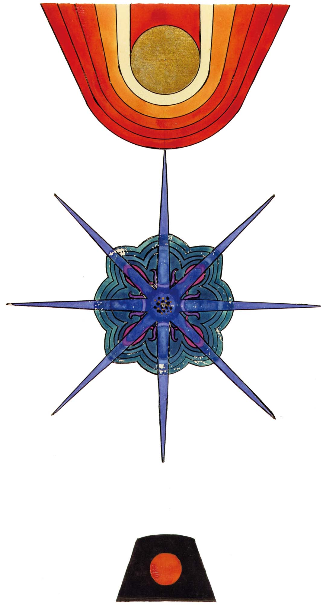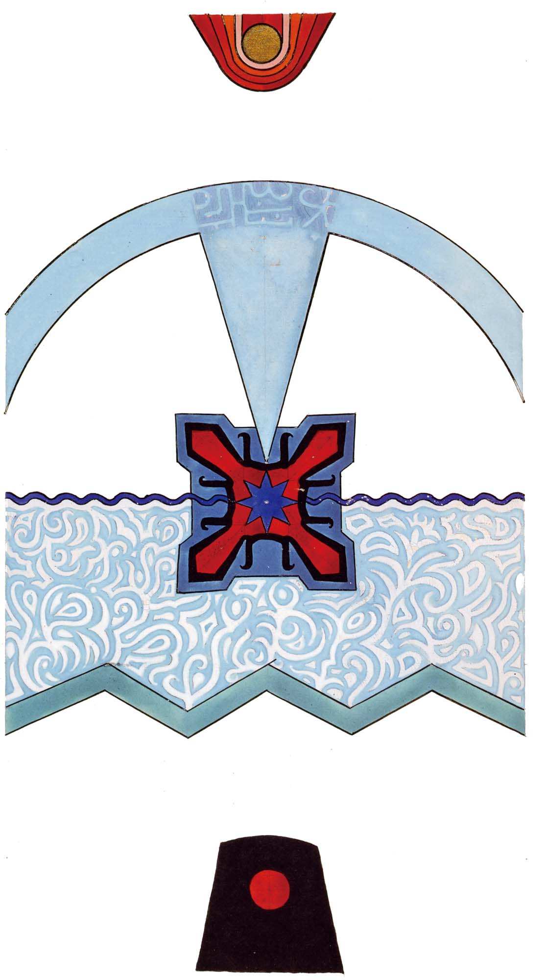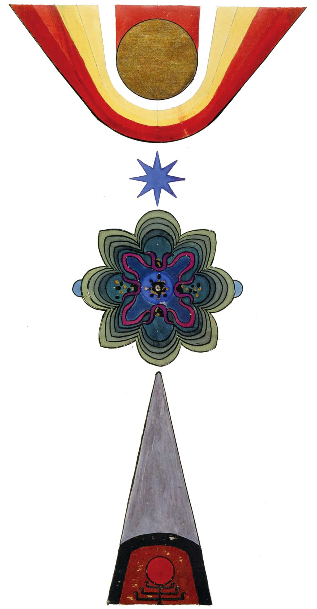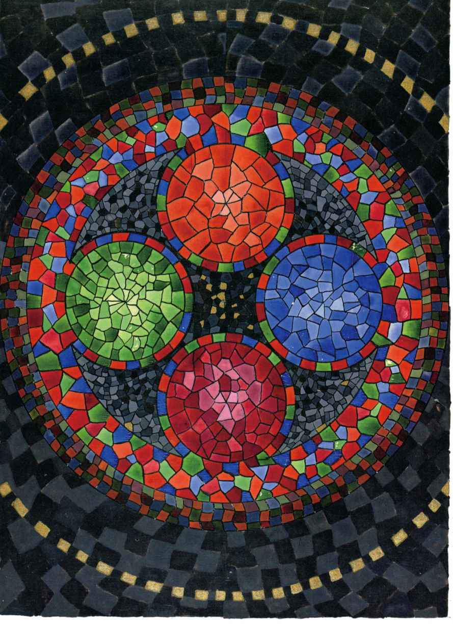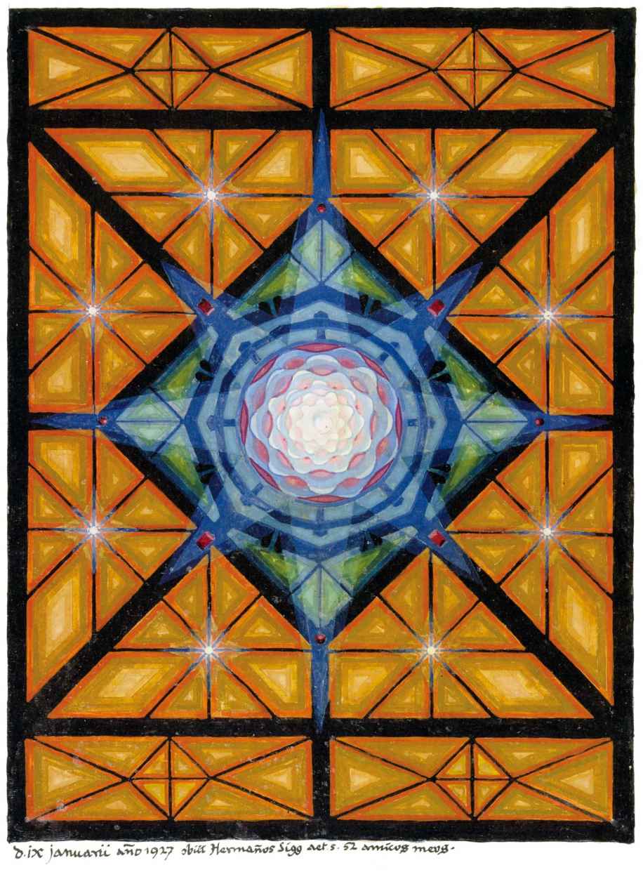 普天大系。(30釐米×34釐米)1955年,榮格的“普天大系”以匿名的形式發表在雜誌《你(Du)》的艾諾斯會議特刊中。1955年2月11日,榮格在寫給瓦爾特·科爾蒂的信中詳細說明他不願意自己的名字出現在這幅圖上(榮格藏品)。他補充以下評論:“它描繪的是宏觀世界中微觀的二律背反和其自身的二律背反。最上方長著翅膀的蛋中的男孩叫艾瑞卡派奧斯(Erikapaios)或法涅斯,使人聯想到俄耳甫斯神的精靈形象。在底部與之相對應的黑色部分是阿布拉克薩斯,他代表的是世界的主宰(dominus mundi),現實世界之主,是矛盾本質的創世者。我們看到生命之樹在這裡發芽,標有vita(生命),而上端相對應的部分是一棵發光的樹,這棵樹像一個有七條分叉的燭臺,寫有ignis(火)和Eros(愛)。燭光指向聖童的精神世界,藝術和科學也屬於這個精神領域,長著翅膀的蛇象徵代表第一個,長著翅膀的老鼠代表第二個(像挖洞活動!)。燭臺是基於神聖數字三的原則(小火焰是三的兩倍和中間的大火焰),而底部的阿布拉克薩斯的世界的特徵是五,這是自然人的數字(他的星星的光線是五的兩倍)。與自然世界一起的動物是邪惡的怪物和一條幼蟲,代表死亡和重生。曼陀羅另一種是水平對應。在左側,我們看到一個環,代表身體或血液,有一條盤在菲勒斯上的蛇,這是繁殖原則。蛇是黑暗和光明,代表地球、月亮和宇宙空間的黑暗世界(因此被稱為撒旦(Satanas)。富饒充滿光明的世界在右側,這裡來自明亮的環frigus sive amor dei(冰冷,或神的愛),聖靈的鴿子張開翅膀,智慧(Sophia)從雙重杯中向左右兩側灑開,這個陰性的環是天,有鋸齒線或射線的大環象徵內在的太陽,其內部是宏觀世界的重複,但在較高和較低的區域像在鏡子中一樣被反轉。這些重複應該被視為無盡的數字,變得越來越小直到最核心處,抵達真正的微觀。”版權所有