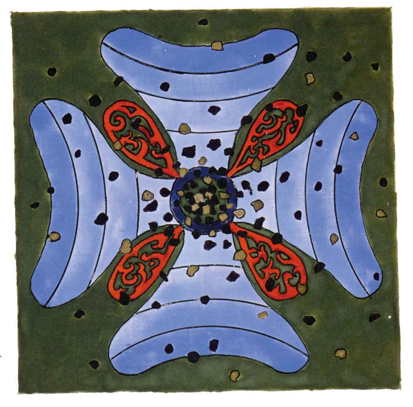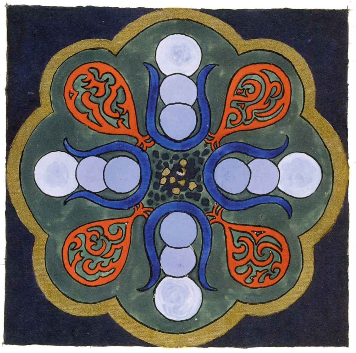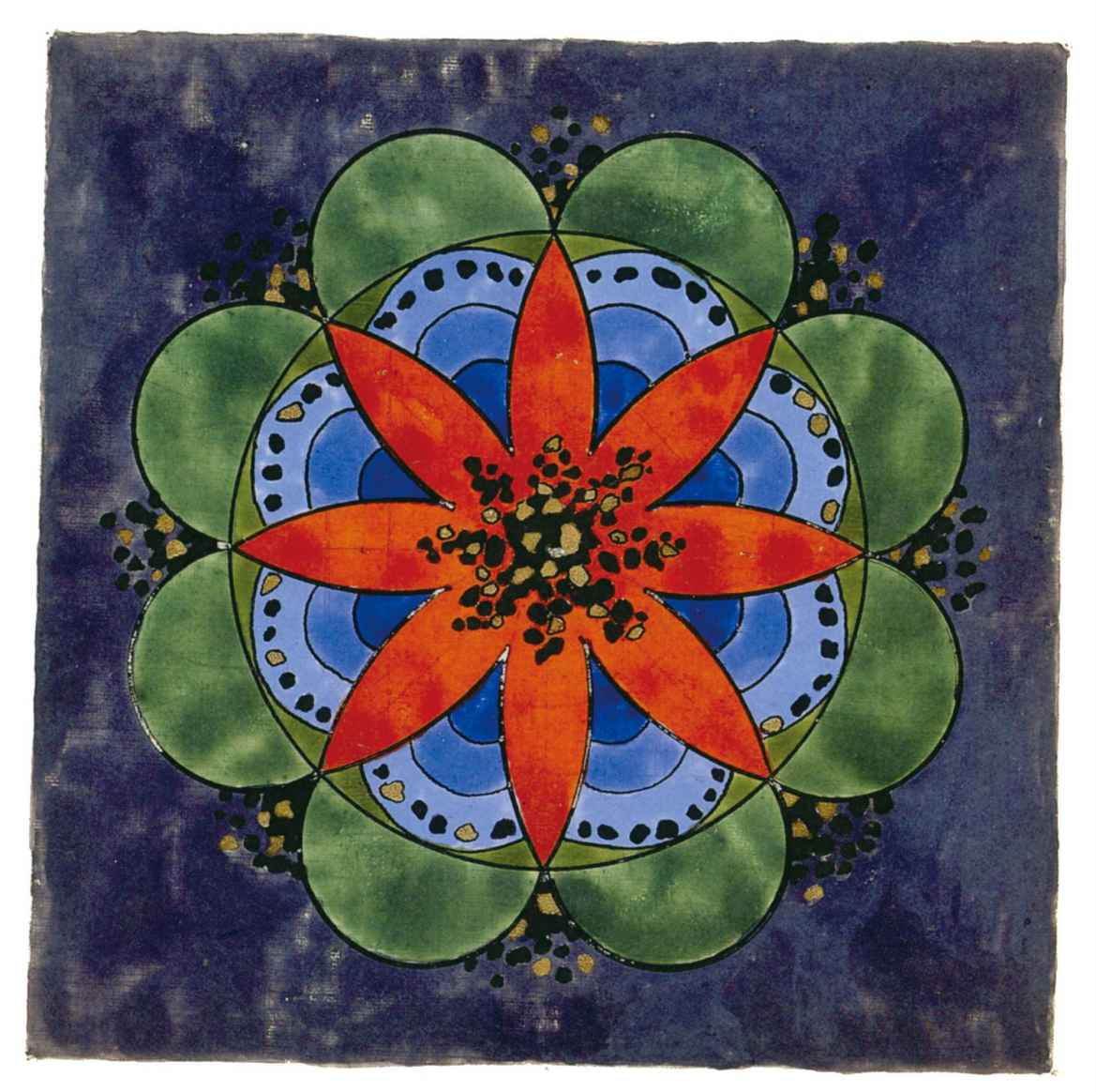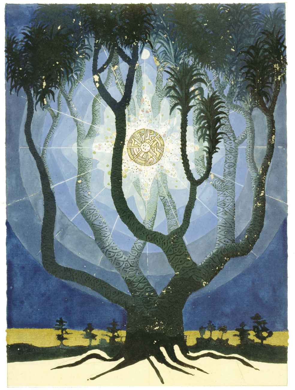 普天大系。(30釐米×34釐米)1955年,榮格的“普天大系”以匿名的形式發表在雜誌《你(Du)》的艾諾斯會議特刊中。1955年2月11日,榮格在寫給瓦爾特·科爾蒂的信中詳細說明他不願意自己的名字出現在這幅圖上(榮格藏品)。他補充以下評論:“它描繪的是宏觀世界中微觀的二律背反和其自身的二律背反。最上方長著翅膀的蛋中的男孩叫艾瑞卡派奧斯(Erikapaios)或法涅斯,使人聯想到俄耳甫斯神的精靈形象。在底部與之相對應的黑色部分是阿布拉克薩斯,他代表的是世界的主宰(dominus mundi),現實世界之主,是矛盾本質的創世者。我們看到生命之樹在這裡發芽,標有vita(生命),而上端相對應的部分是一棵發光的樹,這棵樹像一個有七條分叉的燭臺,寫有ignis(火)和Eros(愛)。燭光指向聖童的精神世界,藝術和科學也屬於這個精神領域,長著翅膀的蛇象徵代表第一個,長著翅膀的老鼠代表第二個(像挖洞活動!)。燭臺是基於神聖數字三的原則(小火焰是三的兩倍和中間的大火焰),而底部的阿布拉克薩斯的世界的特徵是五,這是自然人的數字(他的星星的光線是五的兩倍)。與自然世界一起的動物是邪惡的怪物和一條幼蟲,代表死亡和重生。曼陀羅另一種是水平對應。在左側,我們看到一個環,代表身體或血液,有一條盤在菲勒斯上的蛇,這是繁殖原則。蛇是黑暗和光明,代表地球、月亮和宇宙空間的黑暗世界(因此被稱為撒旦(Satanas)。富饒充滿光明的世界在右側,這裡來自明亮的環frigus sive amor dei(冰冷,或神的愛),聖靈的鴿子張開翅膀,智慧(Sophia)從雙重杯中向左右兩側灑開,這個陰性的環是天,有鋸齒線或射線的大環象徵內在的太陽,其內部是宏觀世界的重複,但在較高和較低的區域像在鏡子中一樣被反轉。這些重複應該被視為無盡的數字,變得越來越小直到最核心處,抵達真正的微觀。”版權所有