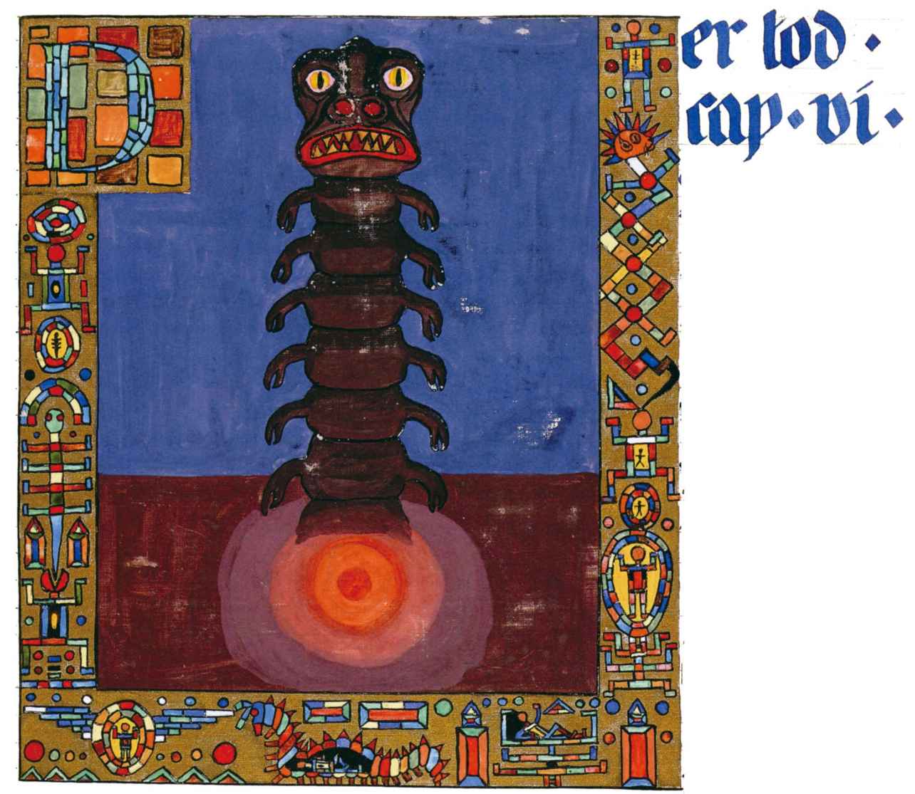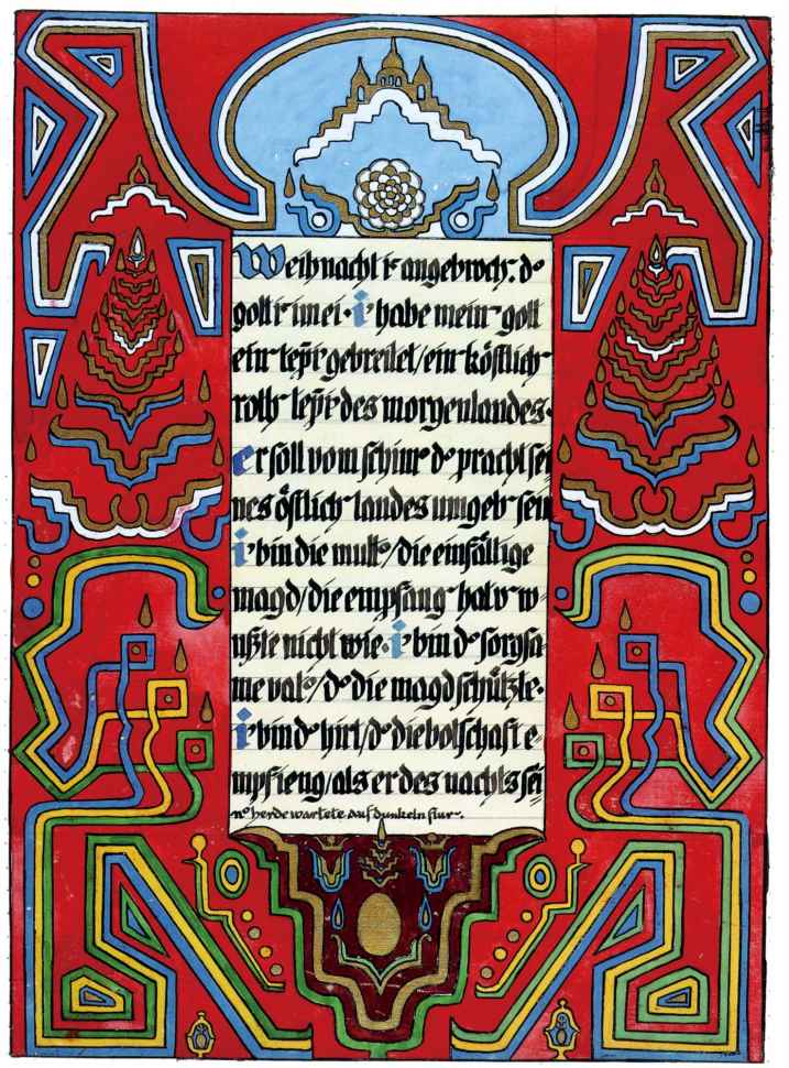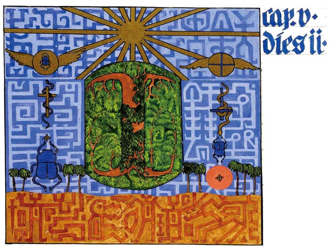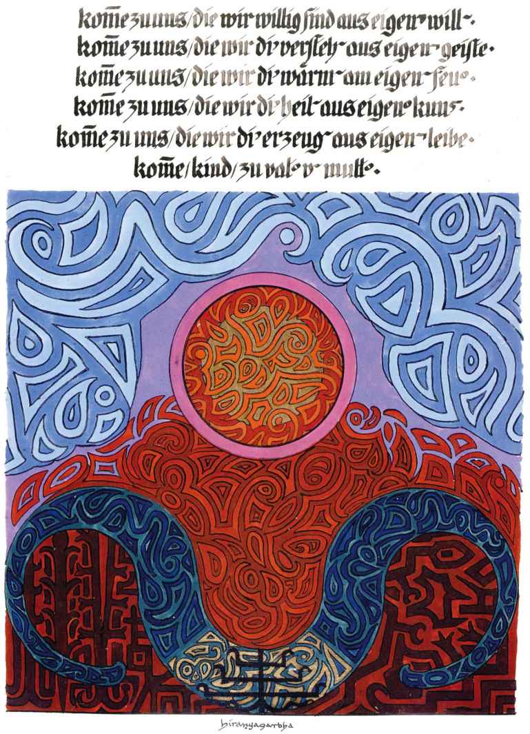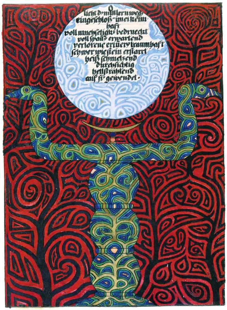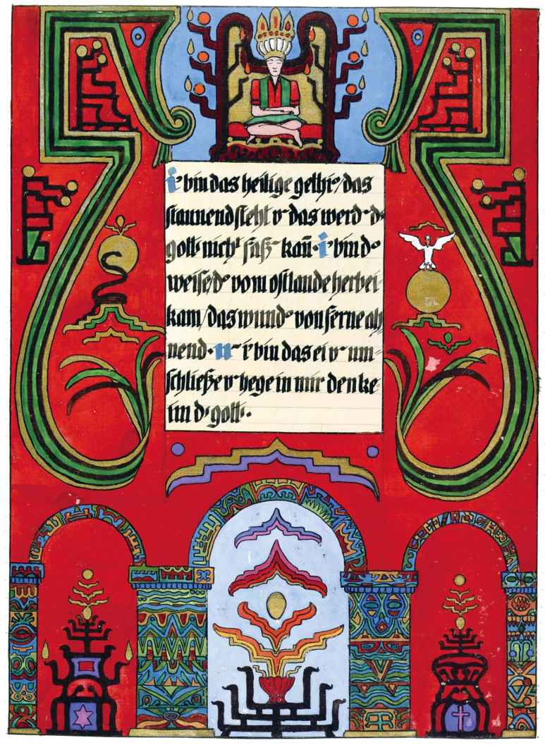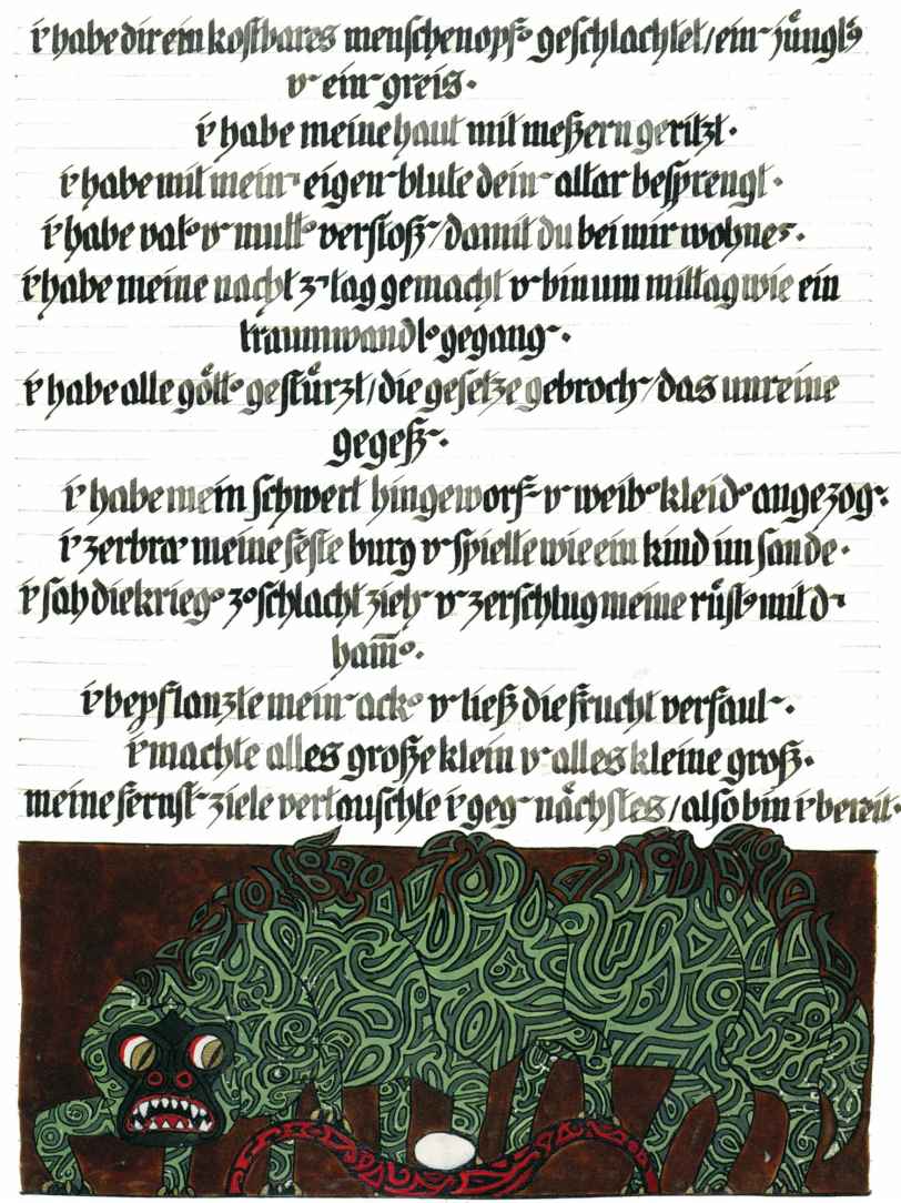 花體字文本源自一個巴比倫的創世神話,出自雨果·格雷斯曼所編的《近東古代的文本與圖片和舊約聖經》,第1卷,(圖賓根:J.莫爾出版社,1909),4頁f,榮格在1912年的《力比多的轉化與象徵》中引用過這個神話(《榮格全集B》,§383)。神話的內容是:“母神胡貝爾創造一切/在她懷著長著尖牙的巨蛇時提供無可抵擋的武器/勢不可當。她的身體充滿血液,而非毒液/身上覆蓋著正在繁殖的巨大蠑螈。她使它們發出可怕的光芒/並令它們升高。只要人看到它們,必將驚恐憔悴/它們的身體必將豎起,而沒有飛起來。