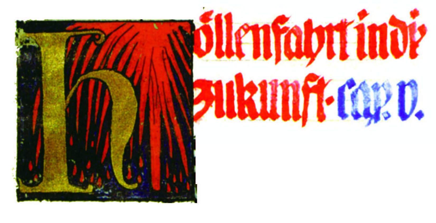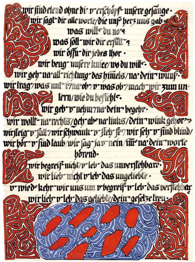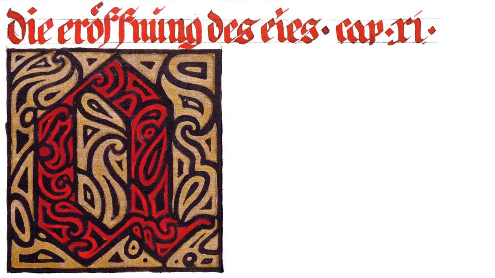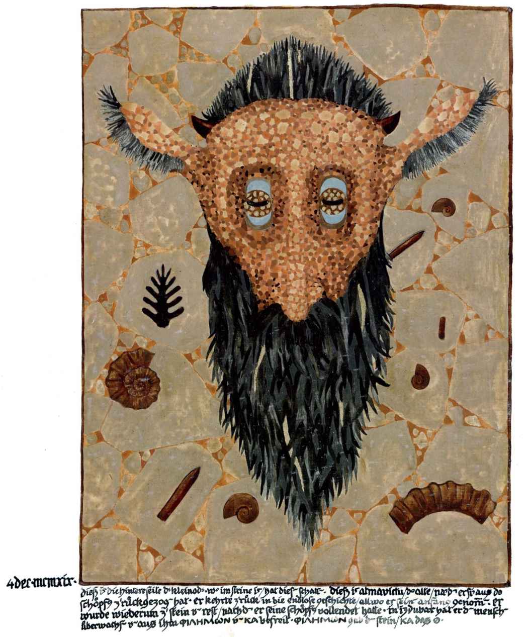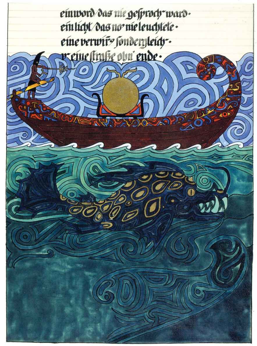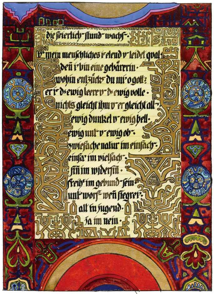 花體字文本源自一個巴比倫的創世神話,出自雨果·格雷斯曼所編的《近東古代的文本與圖片和舊約聖經》,第1卷,(圖賓根:J.莫爾出版社,1909),4頁f,榮格在1912年的《力比多的轉化與象徵》中引用過這個神話(《榮格全集B》,§383)。神話的內容是:“母神胡貝爾創造一切/在她懷著長著尖牙的巨蛇時提供無可抵擋的武器/勢不可當。她的身體充滿血液,而非毒液/身上覆蓋著正在繁殖的巨大蠑螈。她使它們發出可怕的光芒/並令它們升高。只要人看到它們,必將驚恐憔悴/它們的身體必將豎起,而沒有飛起來。