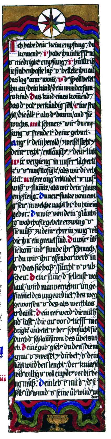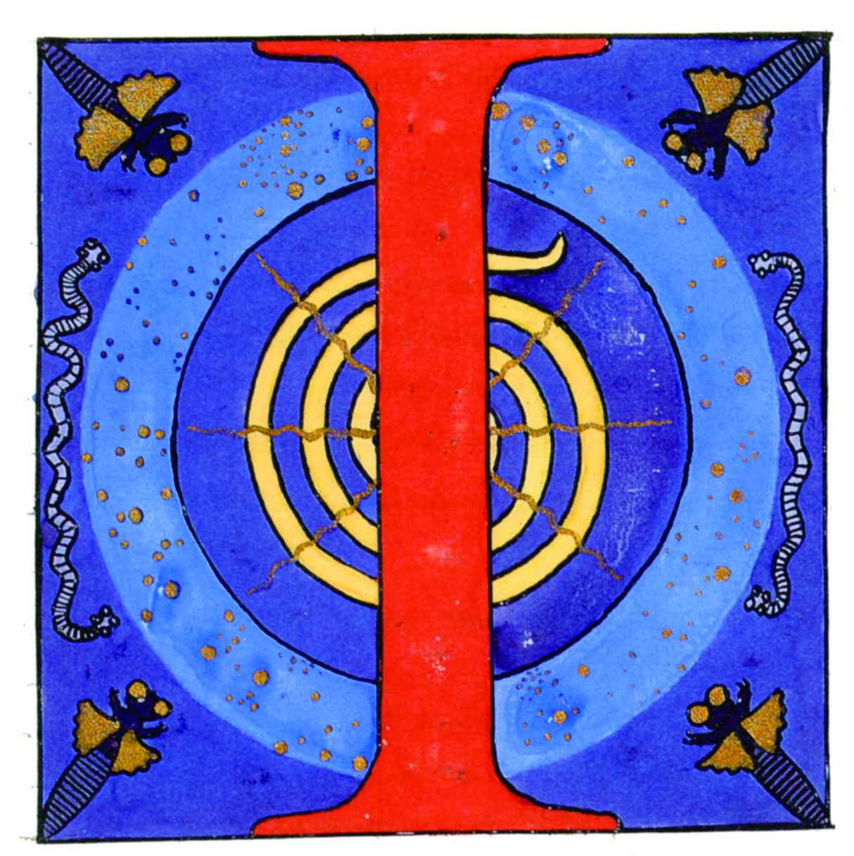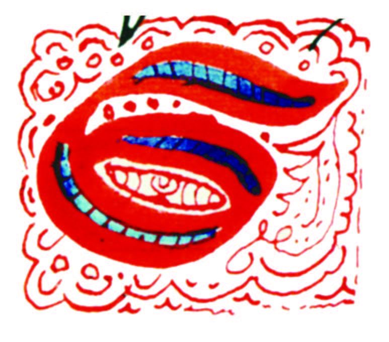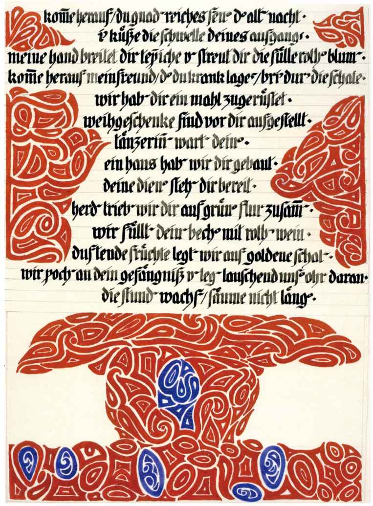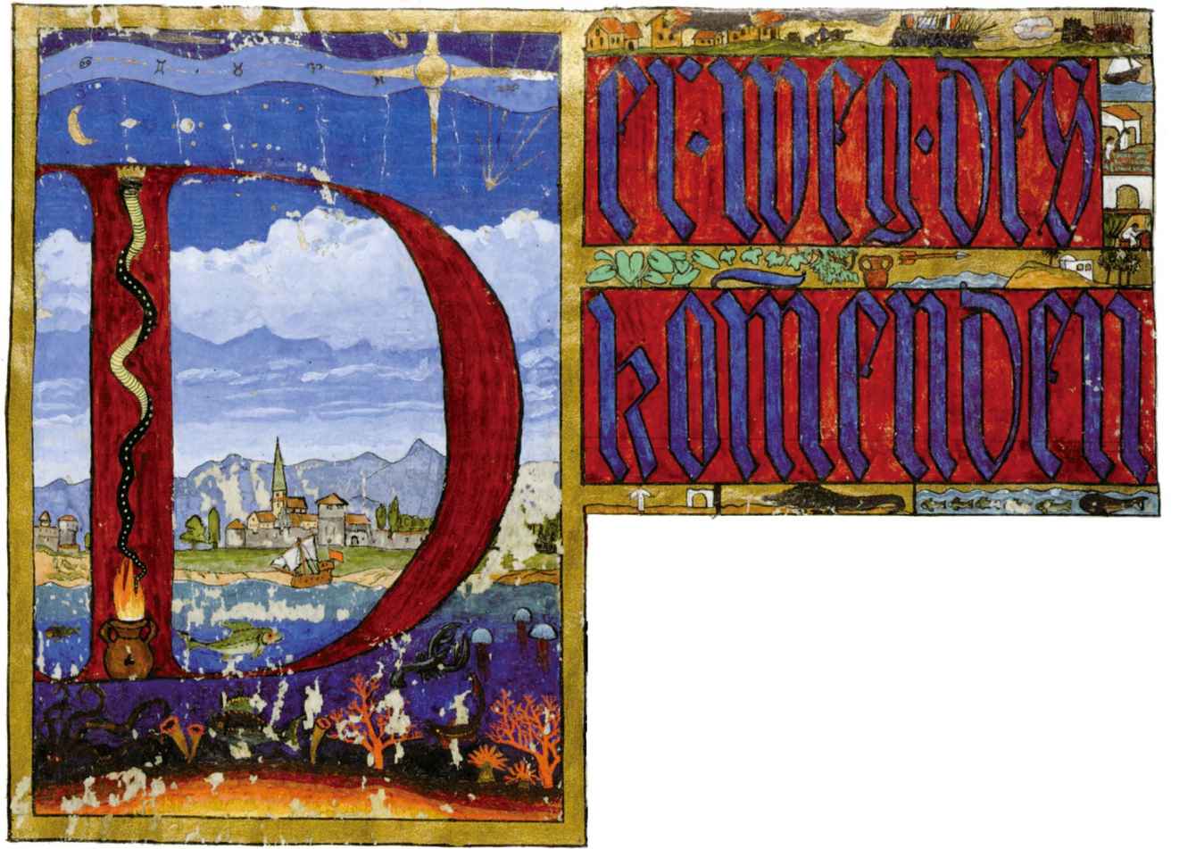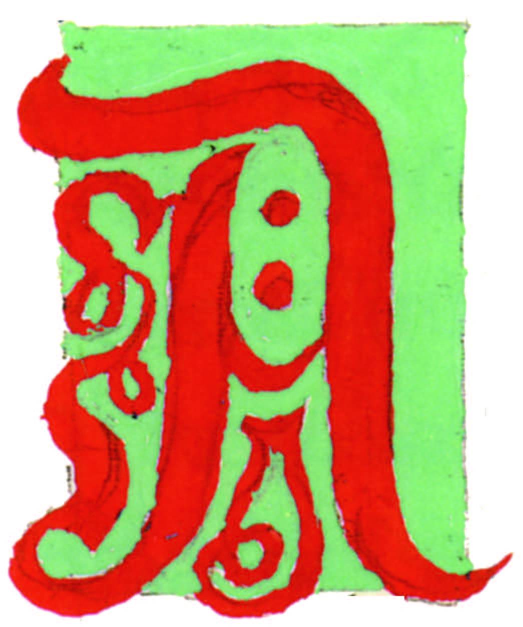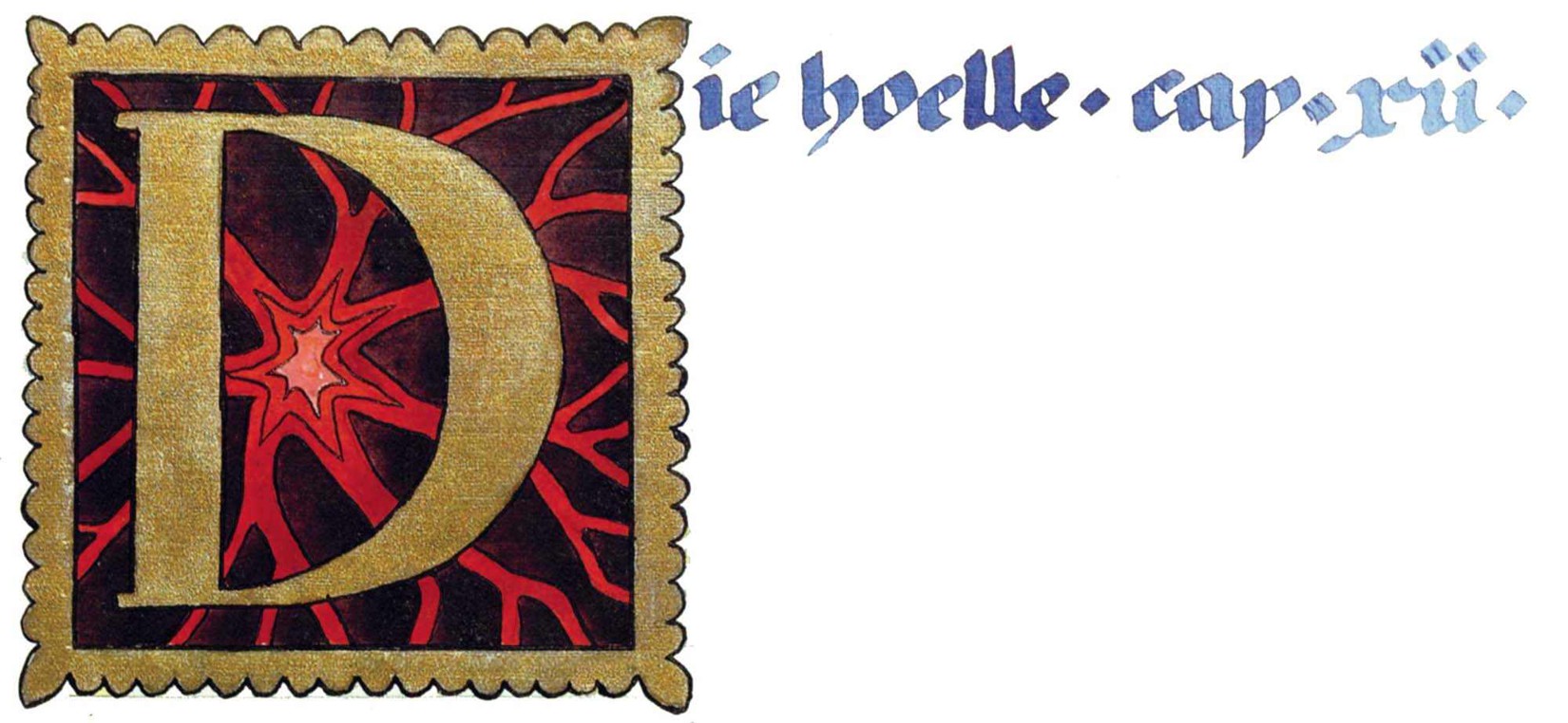 花體字文本源自一個巴比倫的創世神話,出自雨果·格雷斯曼所編的《近東古代的文本與圖片和舊約聖經》,第1卷,(圖賓根:J.莫爾出版社,1909),4頁f,榮格在1912年的《力比多的轉化與象徵》中引用過這個神話(《榮格全集B》,§383)。神話的內容是:“母神胡貝爾創造一切/在她懷著長著尖牙的巨蛇時提供無可抵擋的武器/勢不可當。她的身體充滿血液,而非毒液/身上覆蓋著正在繁殖的巨大蠑螈。她使它們發出可怕的光芒/並令它們升高。只要人看到它們,必將驚恐憔悴/它們的身體必將豎起,而沒有飛起來。
