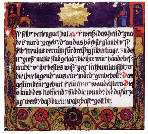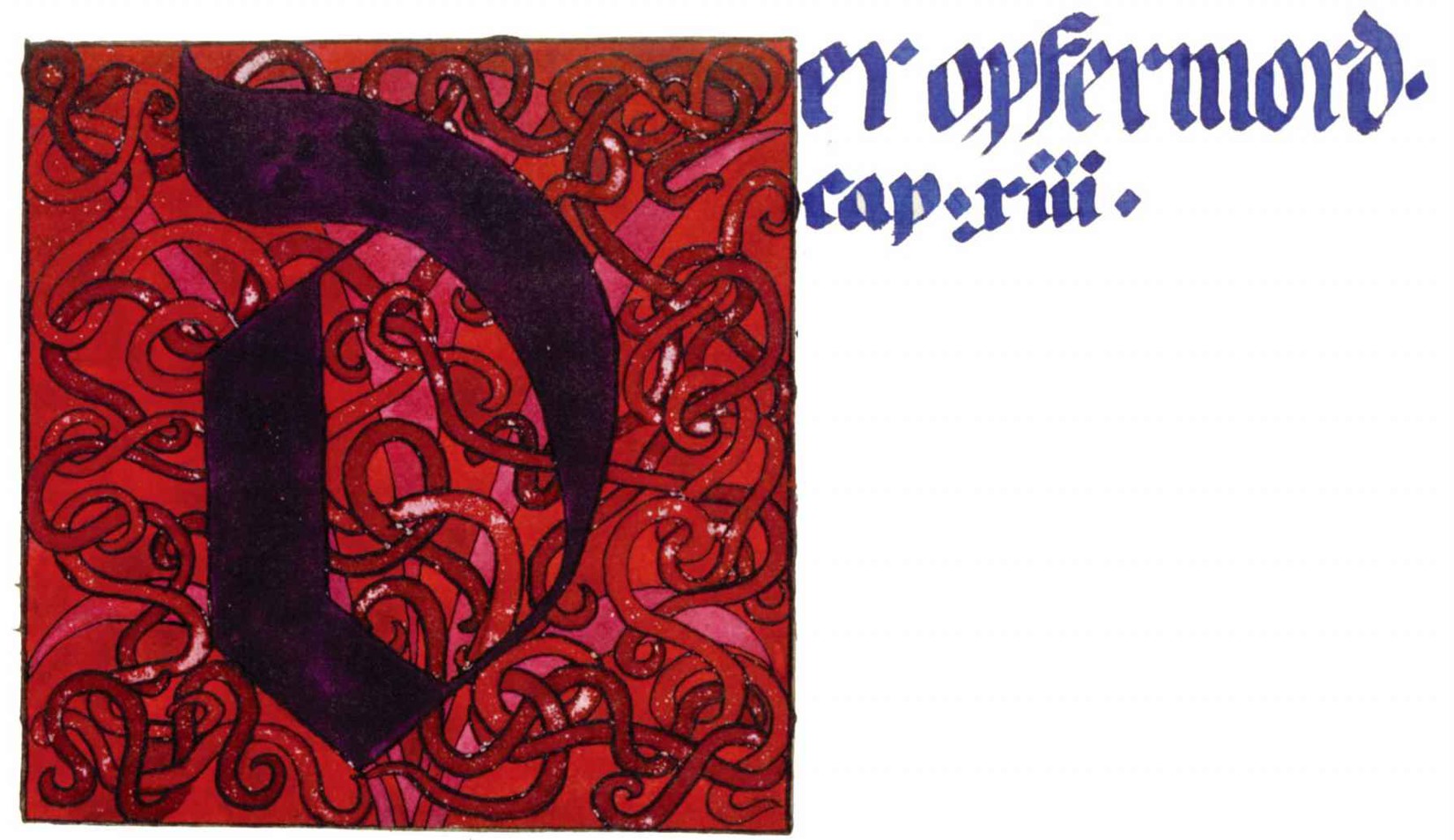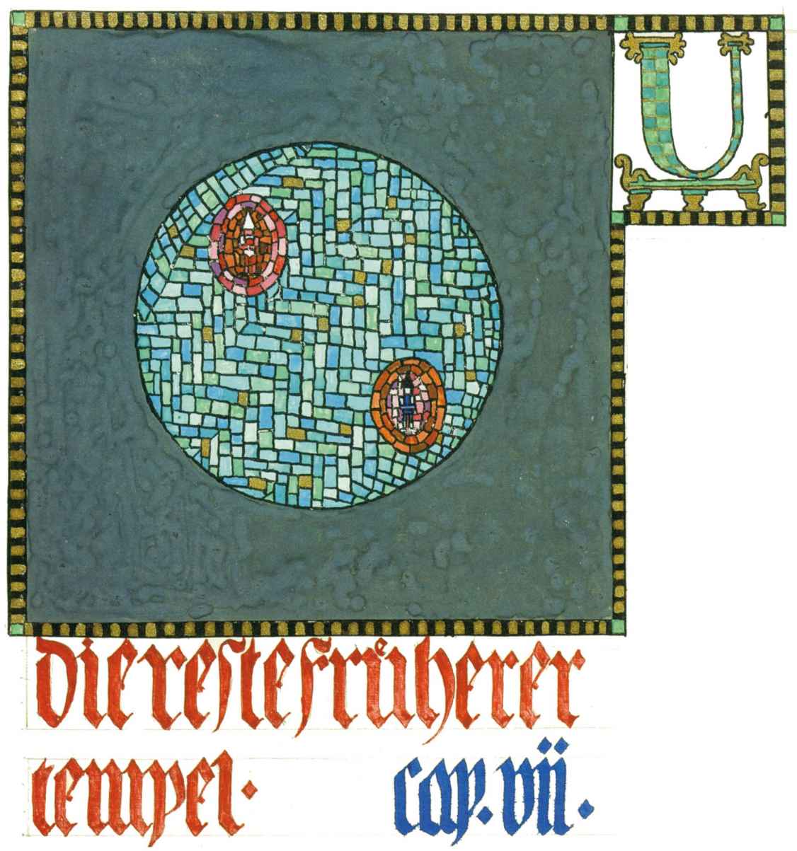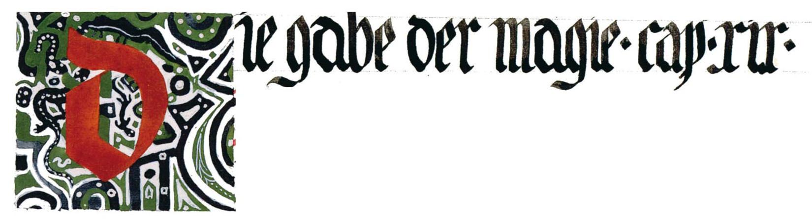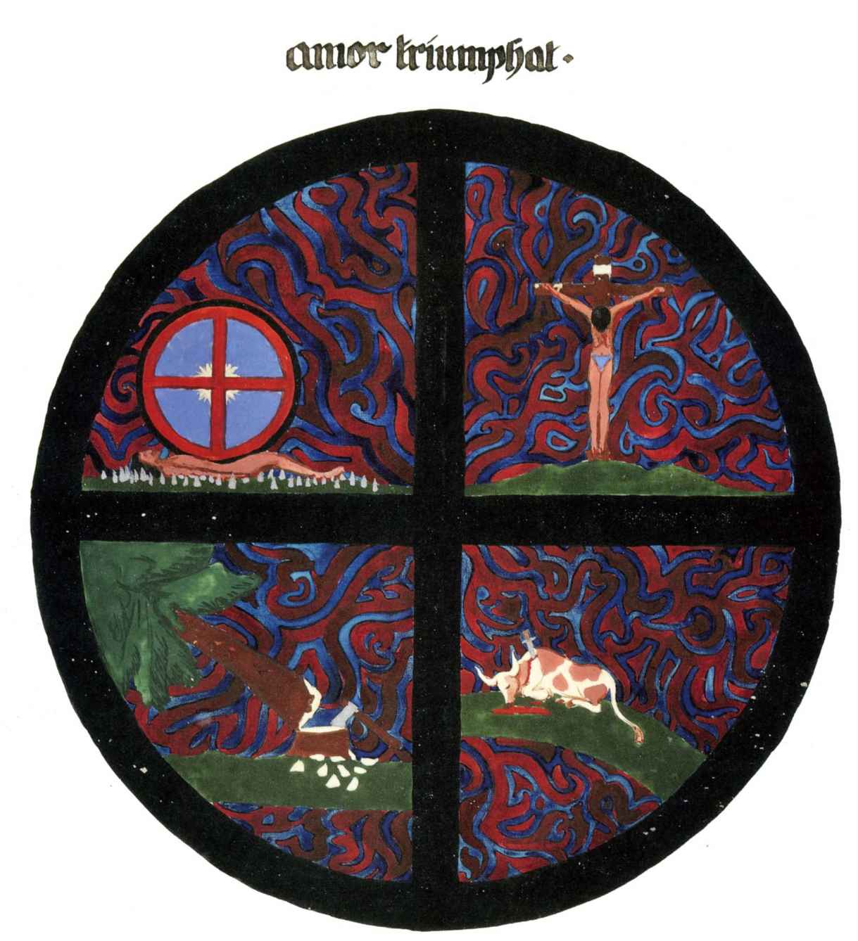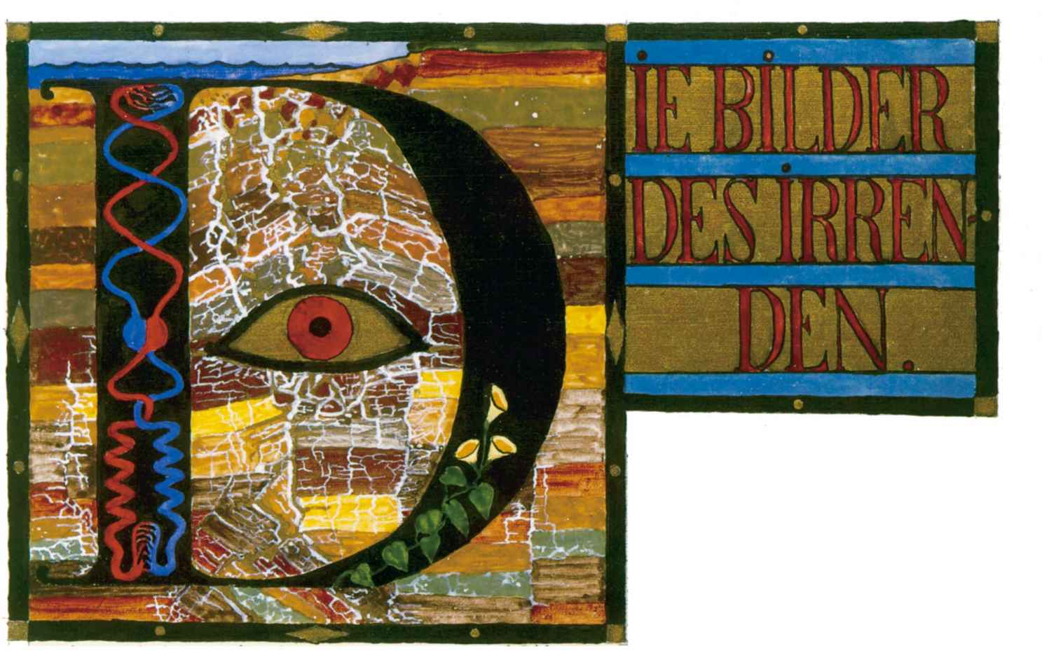花體字文本源自一個巴比倫的創世神話,出自雨果·格雷斯曼所編的《近東古代的文本與圖片和舊約聖經》,第1卷,(圖賓根:J.莫爾出版社,1909),4頁f,榮格在1912年的《力比多的轉化與象徵》中引用過這個神話(《榮格全集B》,§383)。神話的內容是:“母神胡貝爾創造一切/在她懷著長著尖牙的巨蛇時提供無可抵擋的武器/勢不可當。她的身體充滿血液,而非毒液/身上覆蓋著正在繁殖的巨大蠑螈。她使它們發出可怕的光芒/並令它們升高。只要人看到它們,必將驚恐憔悴/它們的身體必將豎起,而沒有飛起來。