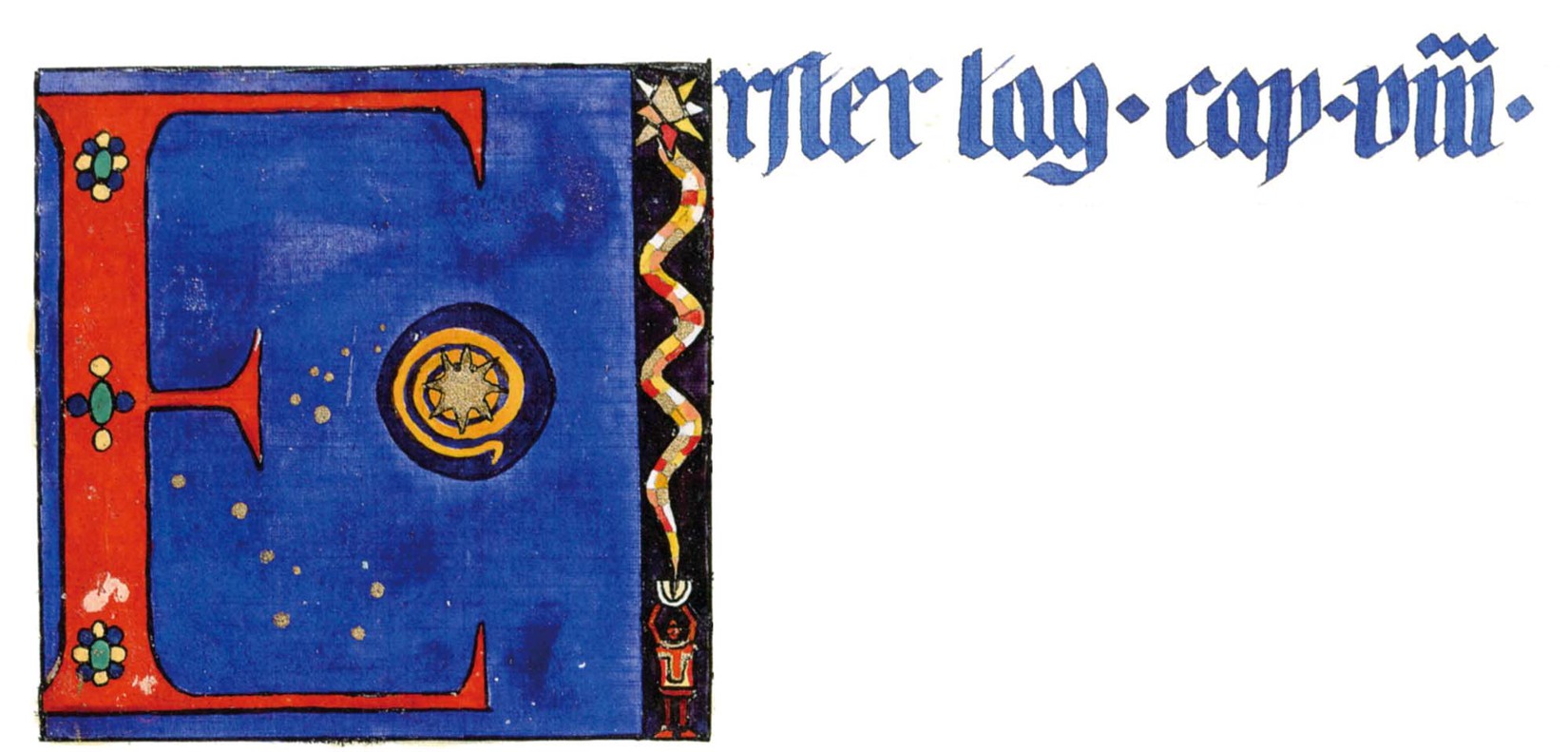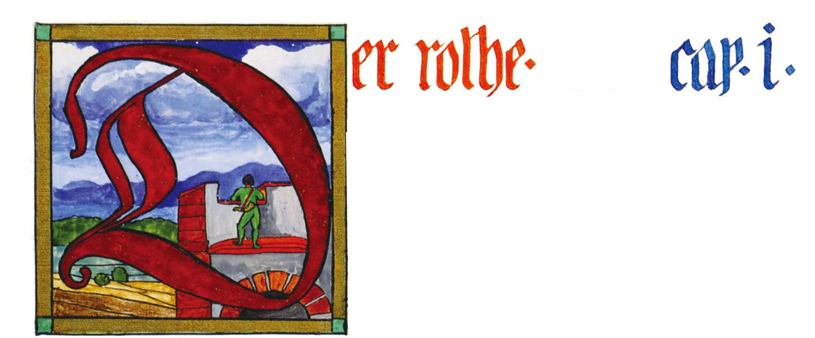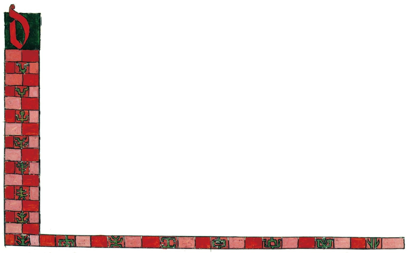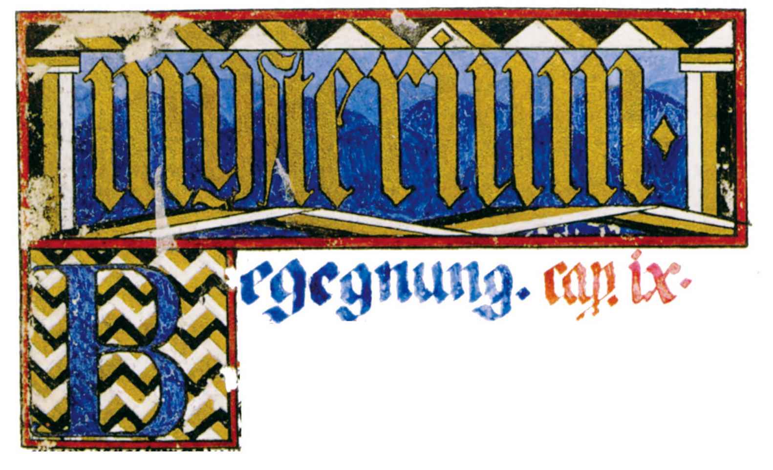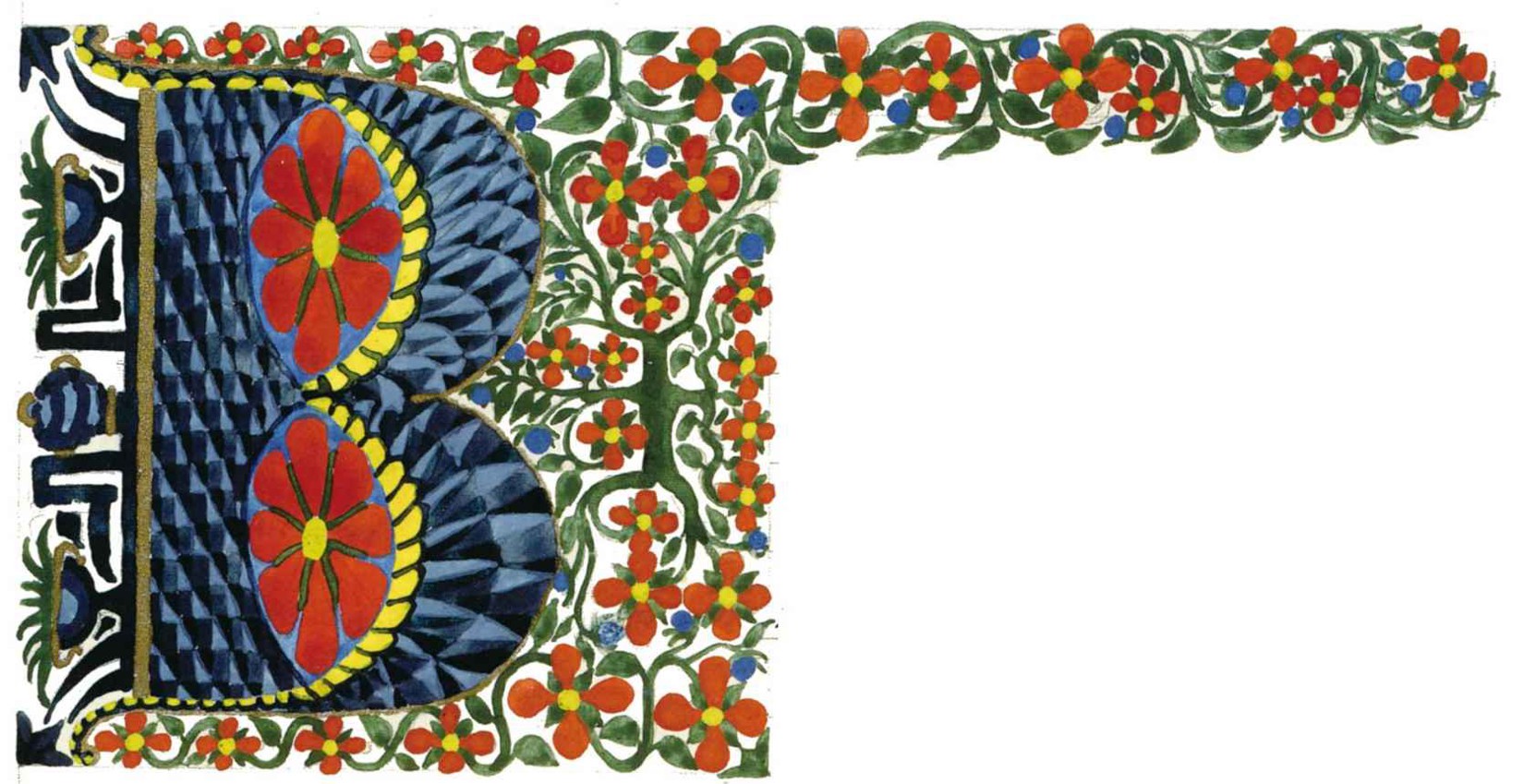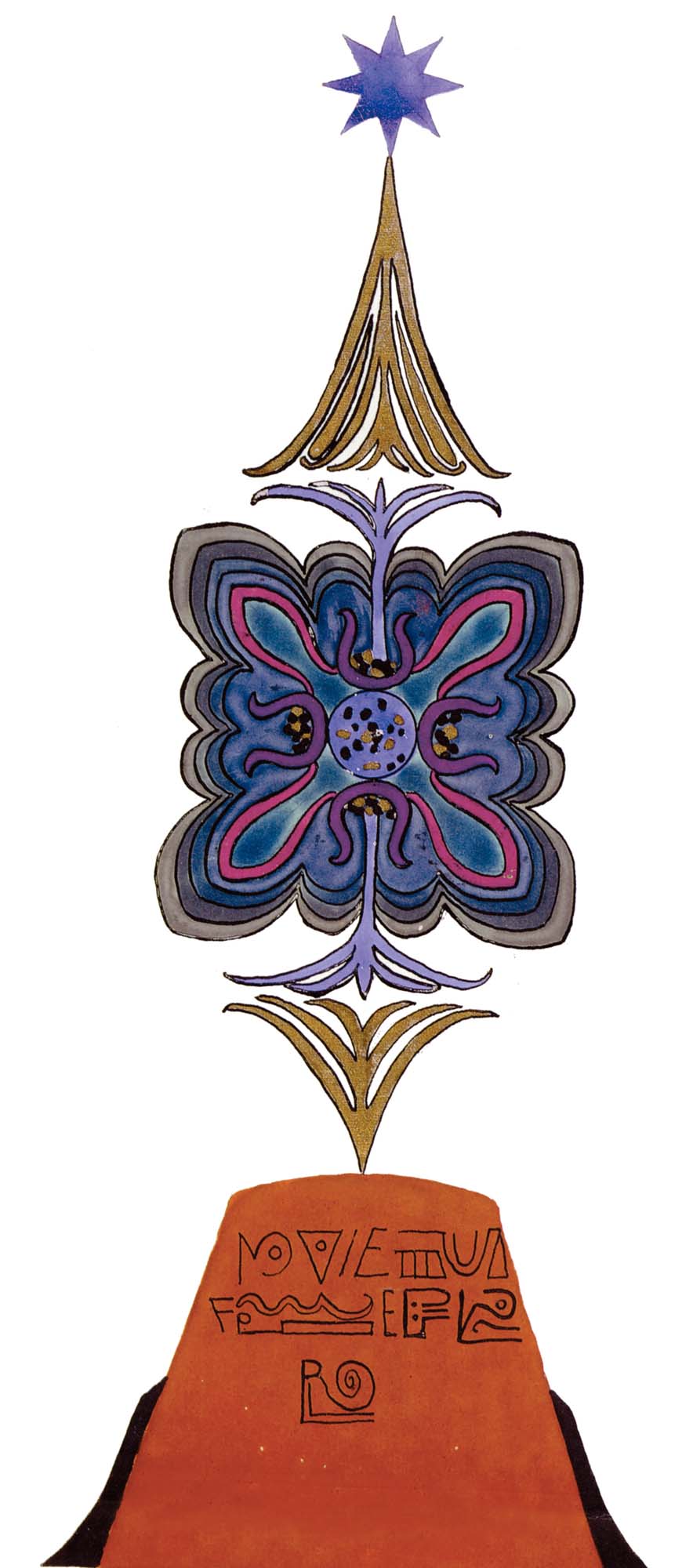 花體字文本源自一個巴比倫的創世神話,出自雨果·格雷斯曼所編的《近東古代的文本與圖片和舊約聖經》,第1卷,(圖賓根:J.莫爾出版社,1909),4頁f,榮格在1912年的《力比多的轉化與象徵》中引用過這個神話(《榮格全集B》,§383)。神話的內容是:“母神胡貝爾創造一切/在她懷著長著尖牙的巨蛇時提供無可抵擋的武器/勢不可當。她的身體充滿血液,而非毒液/身上覆蓋著正在繁殖的巨大蠑螈。她使它們發出可怕的光芒/並令它們升高。只要人看到它們,必將驚恐憔悴/它們的身體必將豎起,而沒有飛起來。