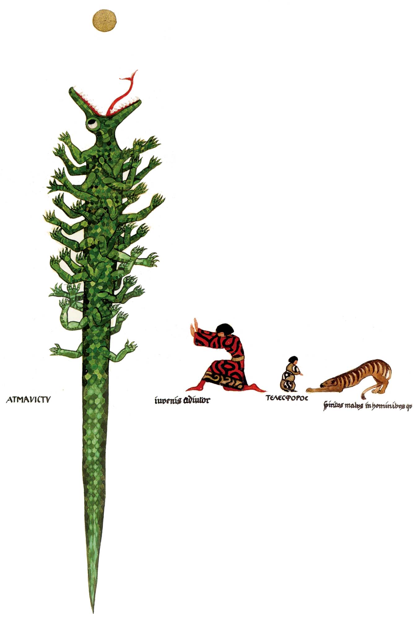 我將上和下綁在一起,我將神和動物綁在一起,我身上一部分是動物,另一部分是神,第三部分是人。蛇在下,人在中,神在上。蛇之外是菲勒斯,接著是地球,然後是月亮,最後是冰冷空洞的外在空間。