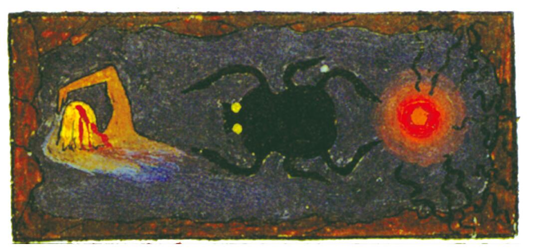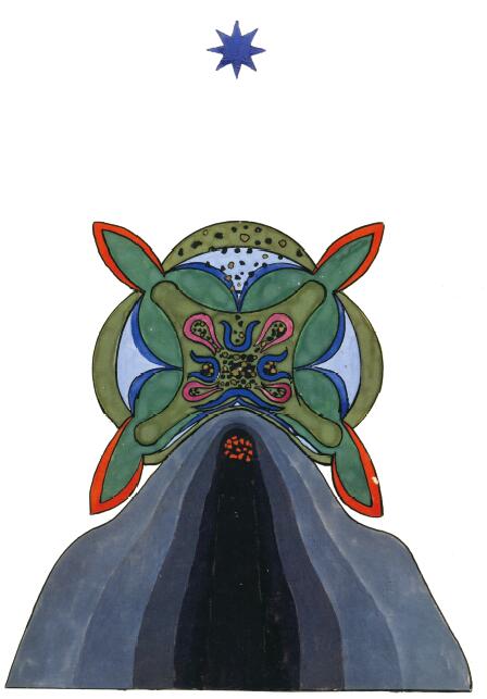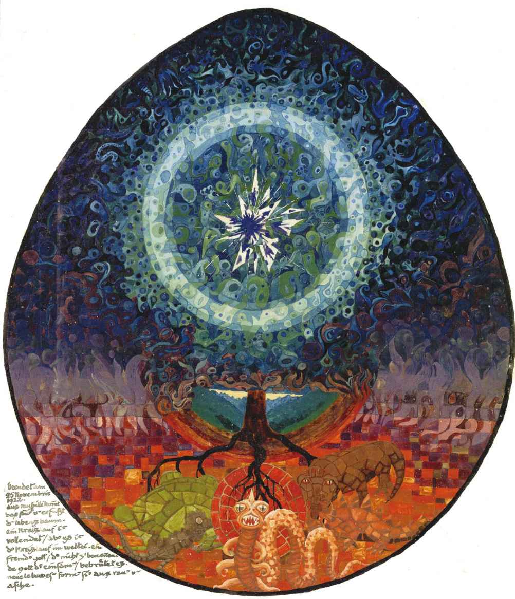 很難強迫意象發聲。但它如此具有隱喻性,所以它應該說話。與以往經驗不同的是,它更多是被見證的,而非被體驗。正因為如此,我把所有意象都置於“神秘戲劇”這個名字之下,更像是隱喻,而非實際的經驗。它們肯定不是刻意的隱喻,它們還沒有被意識性地以隱晦或幻想的方式用來描述經驗。相反,它們以幻象出現。直到我後來再探究它們的時候,我越來越意識到它們不能與其他章節中描繪的經驗相比較。這些意象明顯描繪的都是人格化的無意識思想,它們遵循意象化的模式,它們也喚出更多的思考和詮釋,而非其他的體驗,我不能對它們同樣使用認知,因為它們是相當簡單的經驗。另外,“神秘戲劇”的意象人格化的原則接近思維和理智的理解,同樣它們隱喻的方式也引起這樣一種詮釋的嘗試。