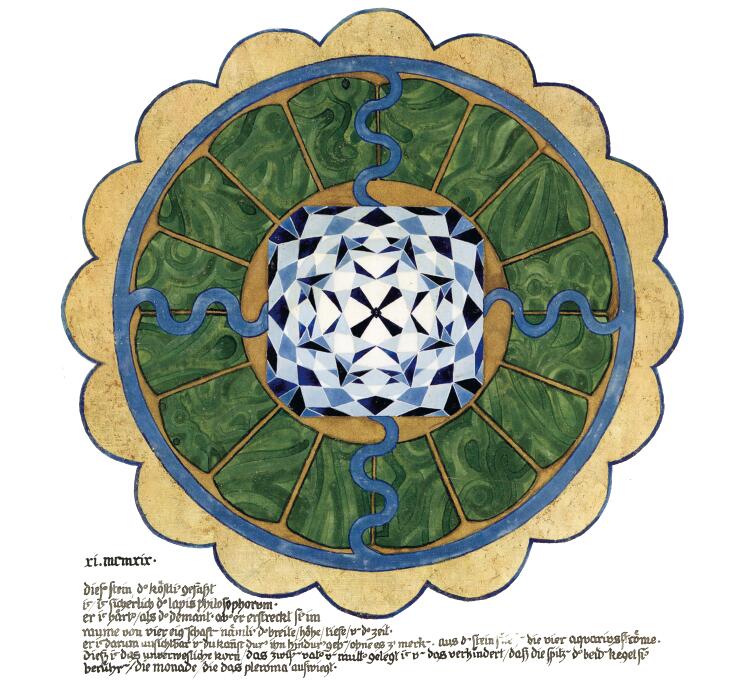 但因為它解開混亂的慾望比對自己自卑的厭惡還要大,因此自我把自己教給邏各斯的引導。因為沒有什麼進入視野來回答出現的問題,更深的深度必須被很明顯地打開。反過來也需要水晶的幫助,也就是說,藉助期待性注意力最大的專注。出現在水晶中的第一個意象是神的母親帶著孩子。