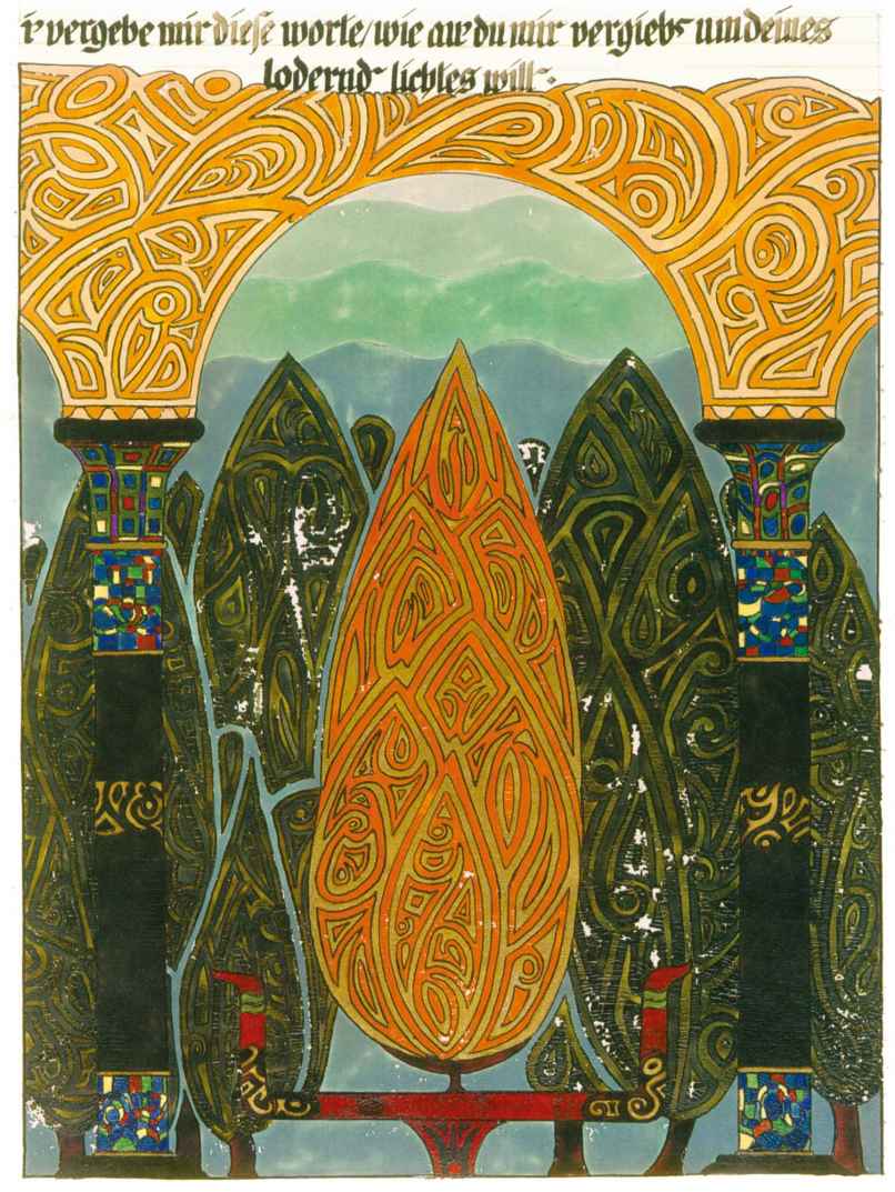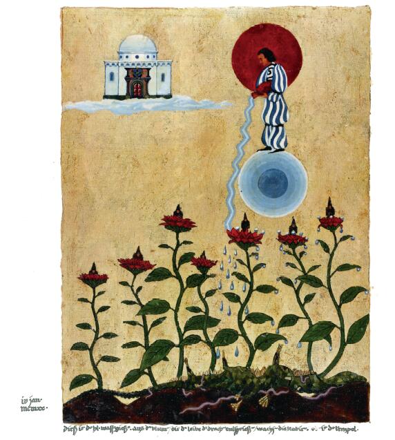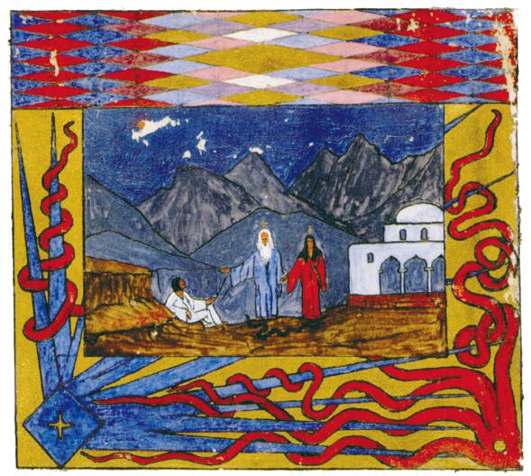 一個像先知一樣的形象,本身很清晰又完整,比失明的莎樂美這種出乎意料的形式激發的好奇少,這是為什麼人會期待形成的過程最先表現出愛洛斯的問題。因此,夏娃的意象最先出現,伴隨著的是樹與蛇的意象。這明顯指的是誘惑,已經完全包括在莎樂美的形象中。誘惑帶來向愛洛斯一側的進一步運動,這反過來又預示著諸多冒險的可能性,而對於這一步,奧德修斯的冒險是最合適的意象。這個意象激發並帶來冒險,就像為新的機遇打開一道門,使目光擺脫黑暗的幽閉和深度,而目光在這裡很快就會被抓住。因此,幻象朝陽光花園開放,花園中開著紅花的樹象徵愛慾情感的發展,花園中的井象徵穩定的來源。井裡的冷水並不使人陶醉,象徵邏各斯。(因此莎樂美后來也講先知的深“井”。)這表示愛慾的發展也是知識的來源,就像以利亞開始講的一樣。
