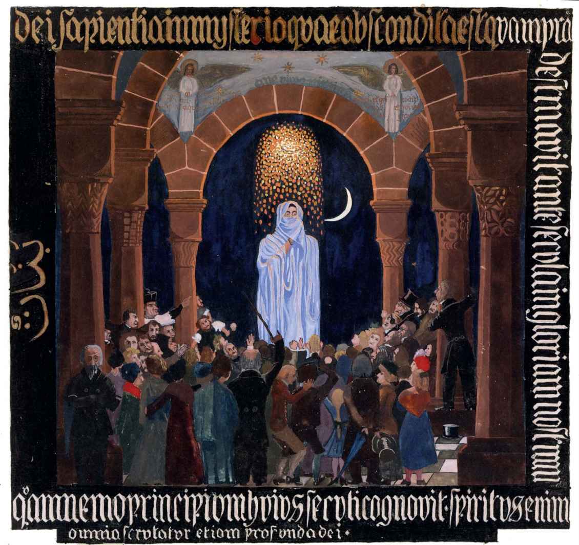 大廳模糊的發光牆指的是某些未識別的東西,或許是某些喚醒好奇心和吸引注意力的重要東西。通過這種方式,創造性的捲入被編織進更深的意象中,因此賦予黑色背景更大的生命力變得可能。這樣一種增強的注意力產生物體的意象,向所有的意圖和目的表現專注,即水晶的意象,而水晶自古以來都被用來製造這樣的幻象。對於注視這些形象的人而言,他們最初是無法理解的,這些形象喚起的是他靈魂中的黑暗歷程,在某種程度上,他們的位置甚至更深(就像在血的幻象中),感知他們需要像水晶一樣的物體來協助。但如上文所寫的一樣,這表現的僅是一種更強的創造性注意的專注。