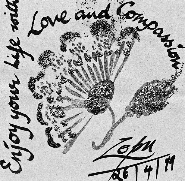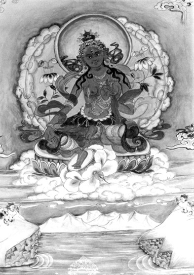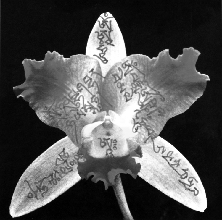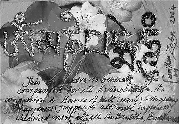 此圖為梭巴仁波切所畫並於2004年賜予一弟子。 此圖上為用藏文書寫的六字大明咒:「唵嘛呢叭咪吽」(OM MANI PADME HUM)。此為觀音菩薩之心咒。 此圖下為用英文書寫的:「這心咒可幫助一切眾生生起慈悲心。而慈悲心是眾生所有幸福快樂(現世及究竟)的源泉,為諸佛和菩薩最珍惜的心法。梭巴2004」 |