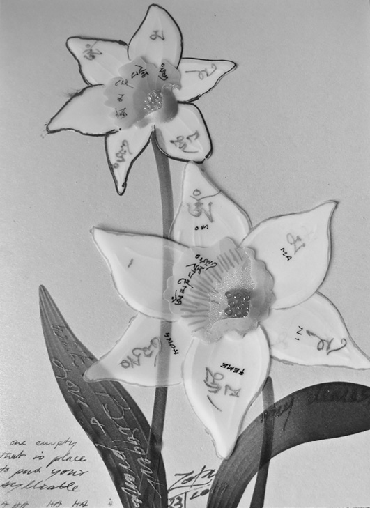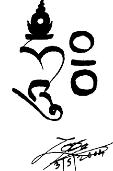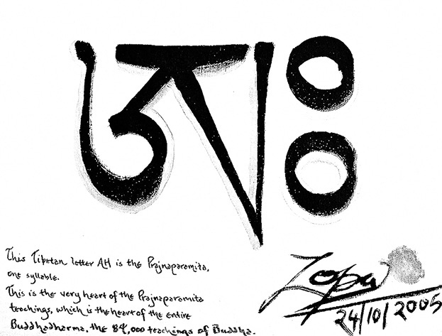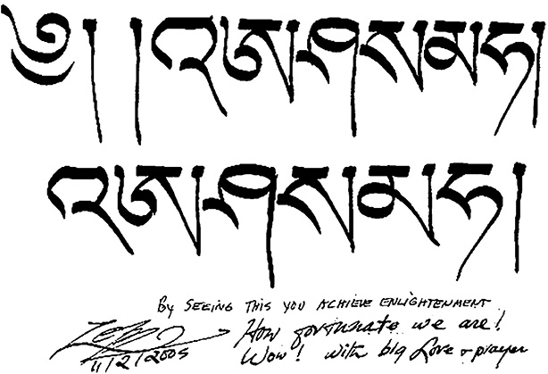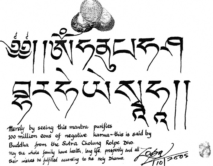 梭巴仁波切2005年以藏文書寫:見則淨業咒。其下英文寫道:「如古佛經記載:只要見到此心咒,即可淨化一千劫的惡業。願您闔家健康、長壽、興隆,一切願望都如法實現。梭巴2005.10」 |
