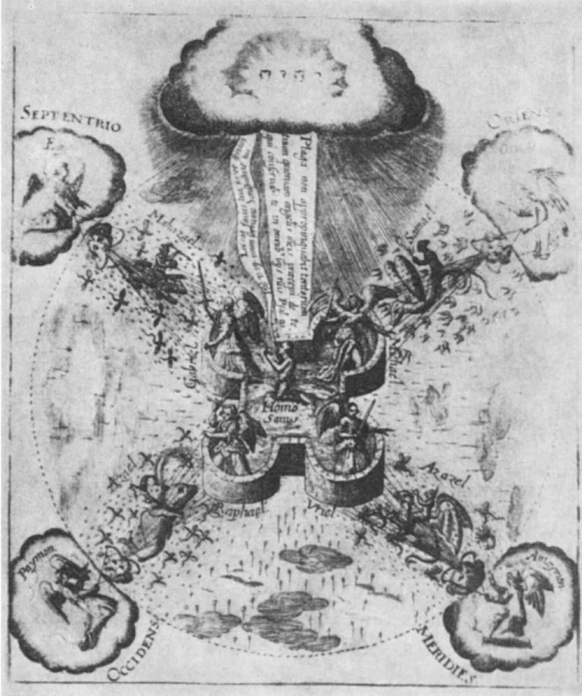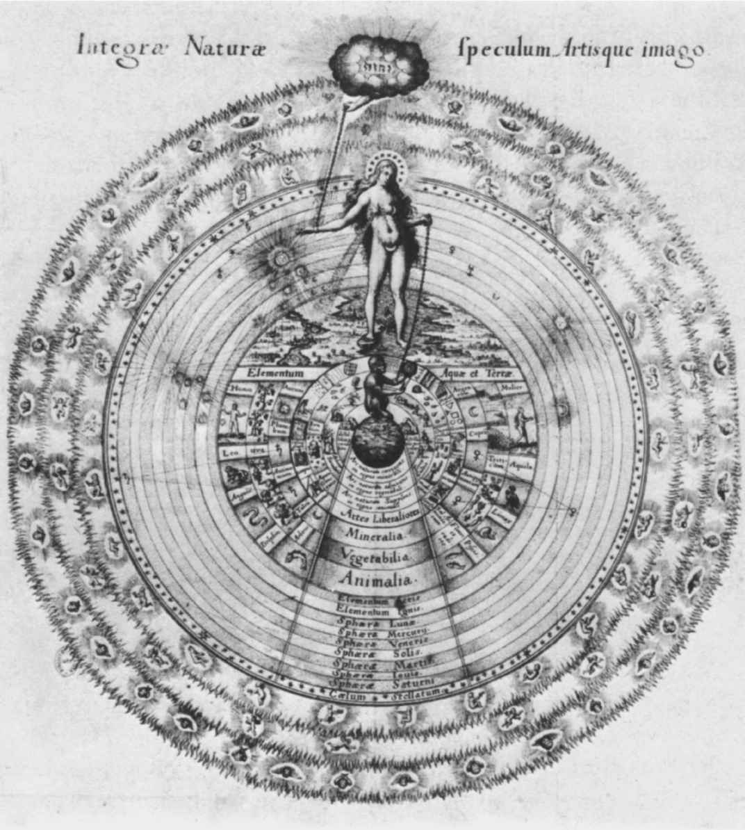 圖8 世界靈魂(anima mundi),人類的導師,她自己則受上帝指導。布里(J.T. de Bry)的版畫,引自Fludd,Utriusque cosmi,165,pp.4/5。