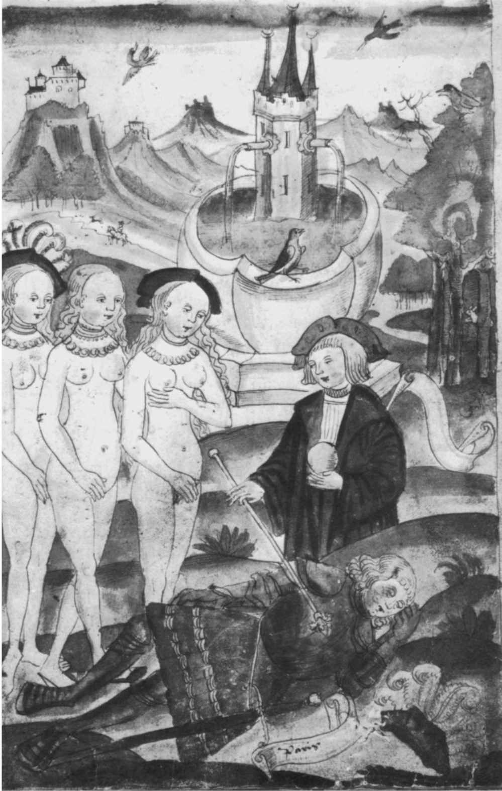 圖9 把睡著的國王喚醒被描述為帕里斯的判斷,而赫爾墨斯則被描述為死神的嚮導。引自Aquinas,“De alchimia”(手稿,16世紀),20,ix,fol.78。