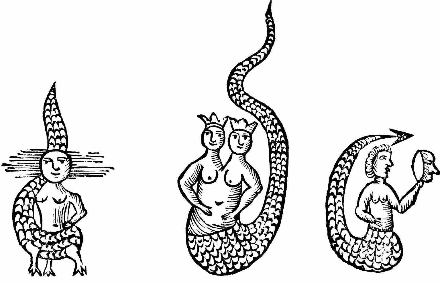 圖10、圖11、圖12 梅露西娜;兩個頭的梅露西娜;戴面具的美人魚。引自Eleazar,Uraltes chymisches Werk,153,三個圖分別對應於第85頁、第85頁和第98頁。