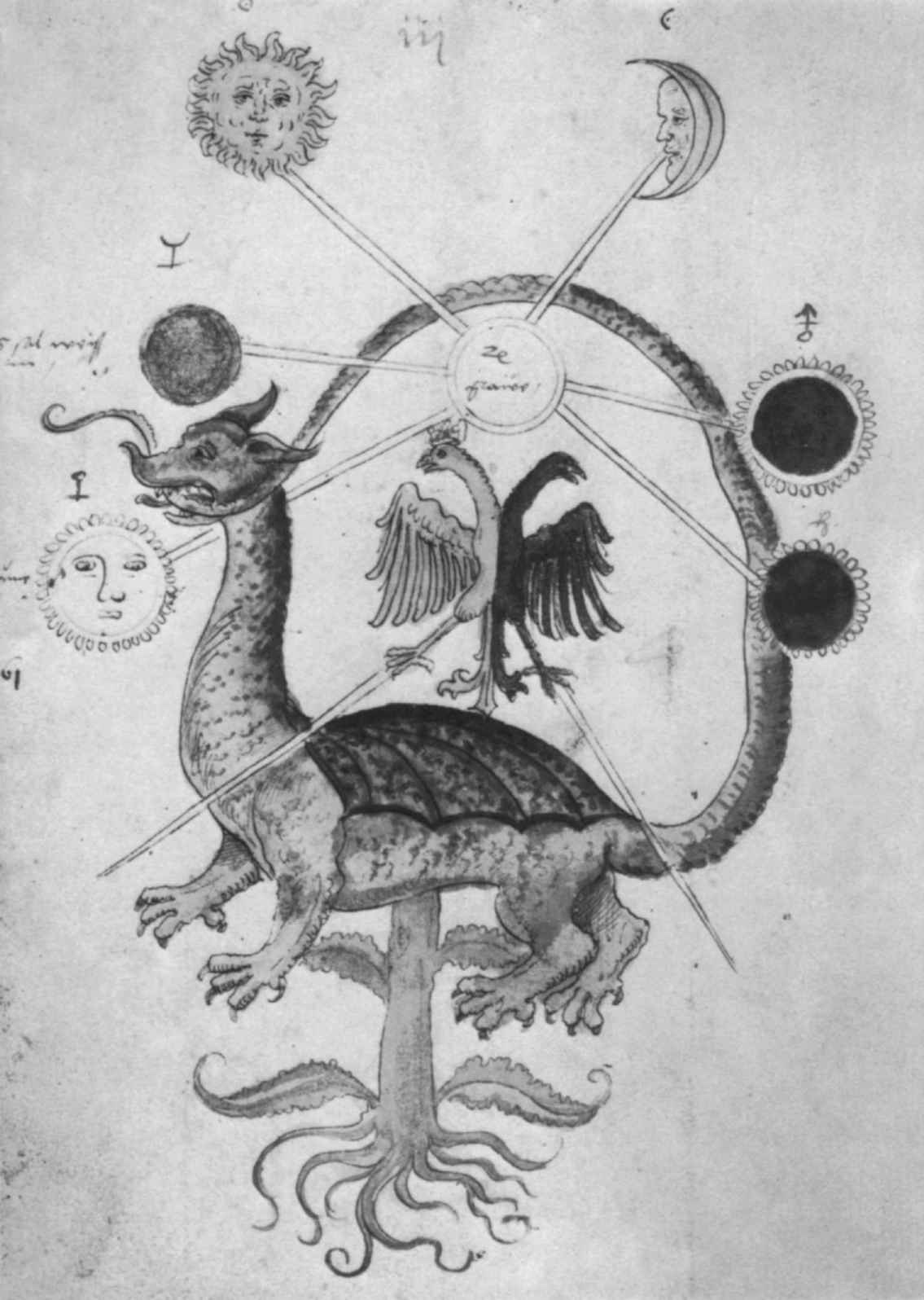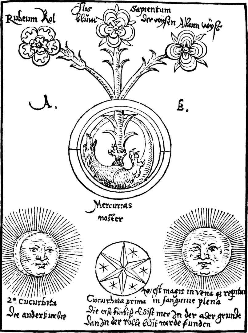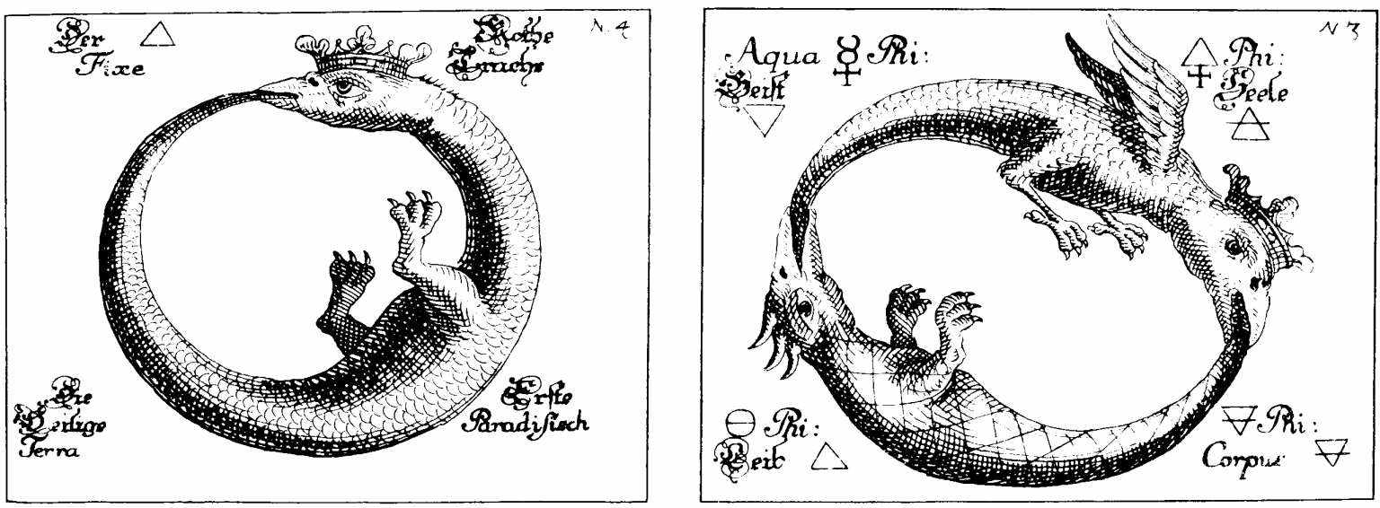 圖13 “咬尾蛇”(Uroboros)是鍊金過程的原初物質(prima materia),上方:紅色和白色的玫瑰,以及智慧之花。下方:太陽和月亮的化合(ciniunctio)。中間:作為兒子的哲人石。引自Reusner,Pandora,281,p.257。