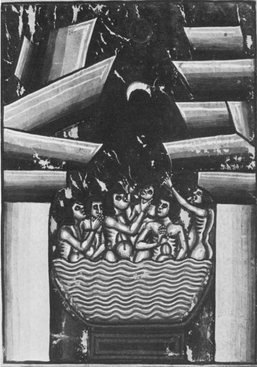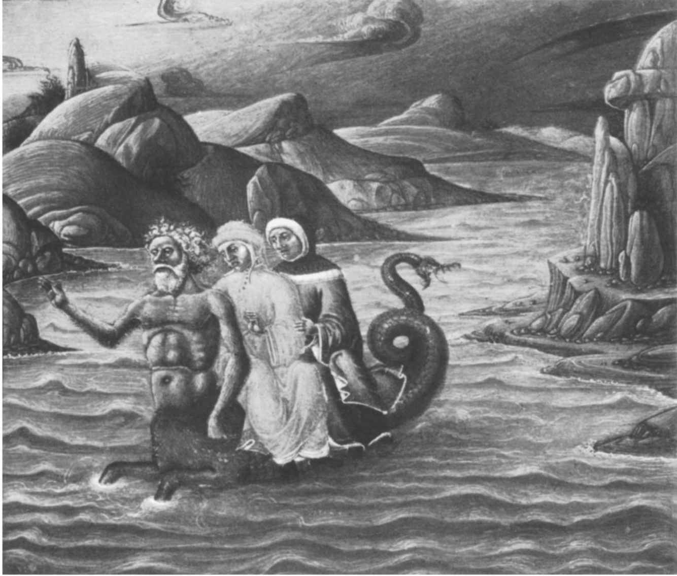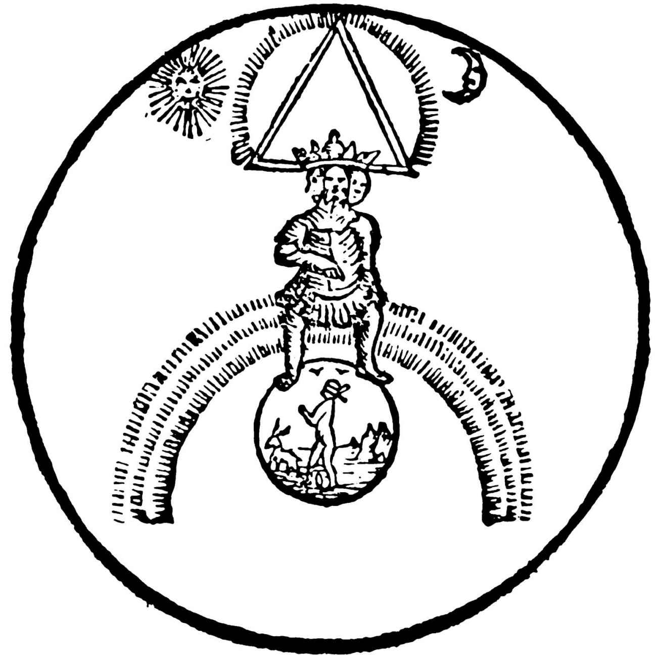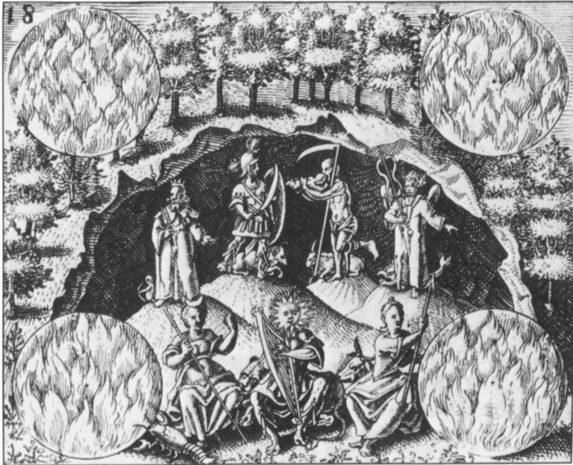 只有神祇才能安然無恙地走在彩虹橋上;只有終有一死的人才會掉下去並接受死亡,因為彩虹只是跨越天空的一種可愛的假象,不是血肉之身的人類走的公路。這些人必須“從橋下”走過(圖16)。但是水也從橋下流過,沿著它自己的傾斜度往最低處流。這個暗示將在後面予以證實。