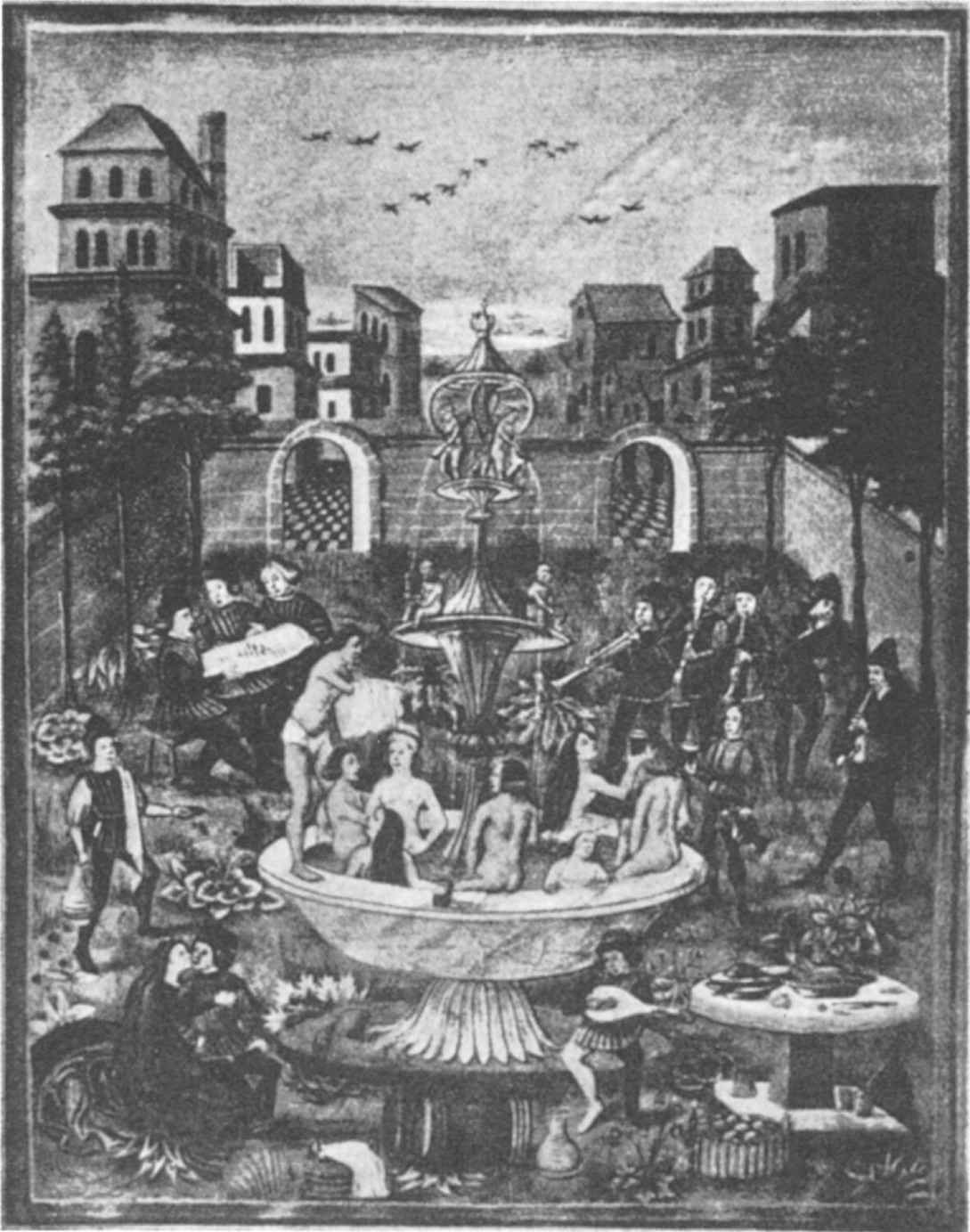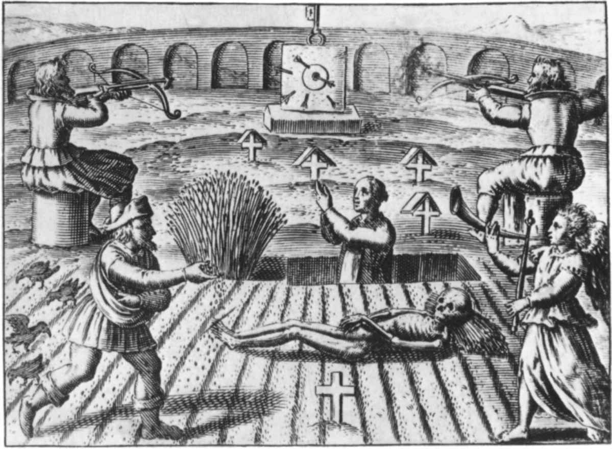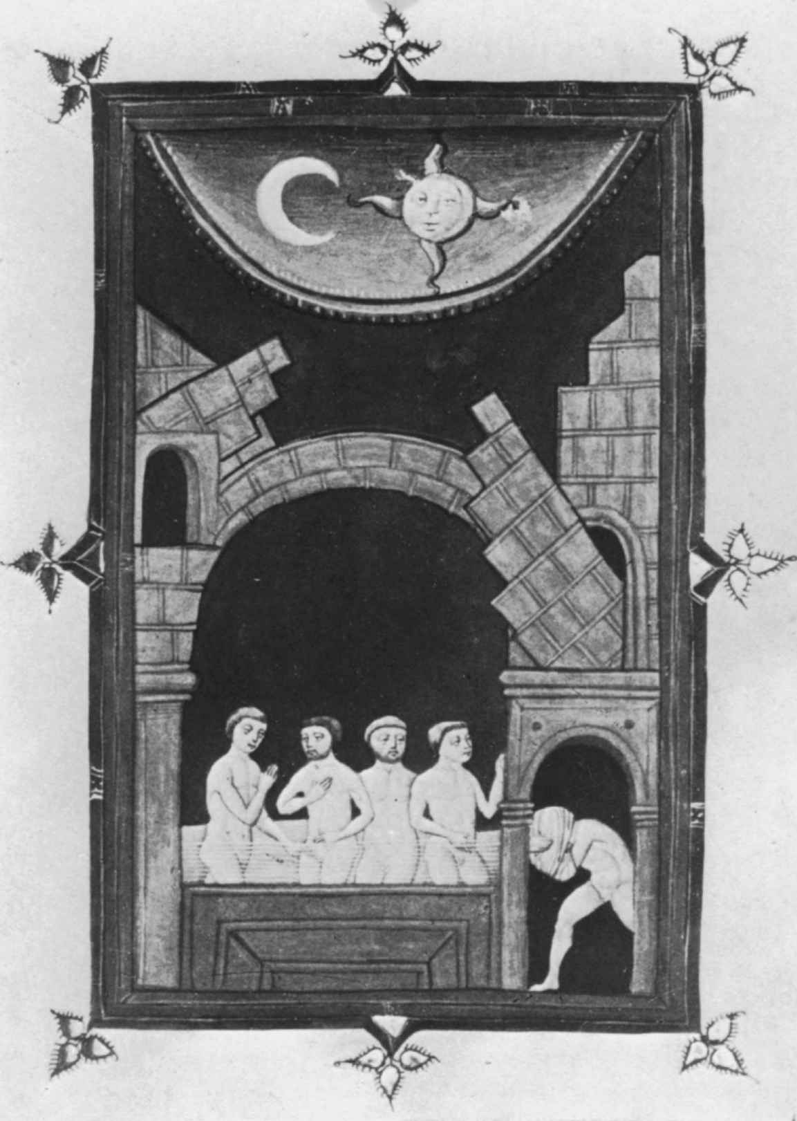 只有神祇才能安然無恙地走在彩虹橋上;只有終有一死的人才會掉下去並接受死亡,因為彩虹只是跨越天空的一種可愛的假象,不是血肉之身的人類走的公路。這些人必須“從橋下”走過(圖16)。但是水也從橋下流過,沿著它自己的傾斜度往最低處流。這個暗示將在後面予以證實。