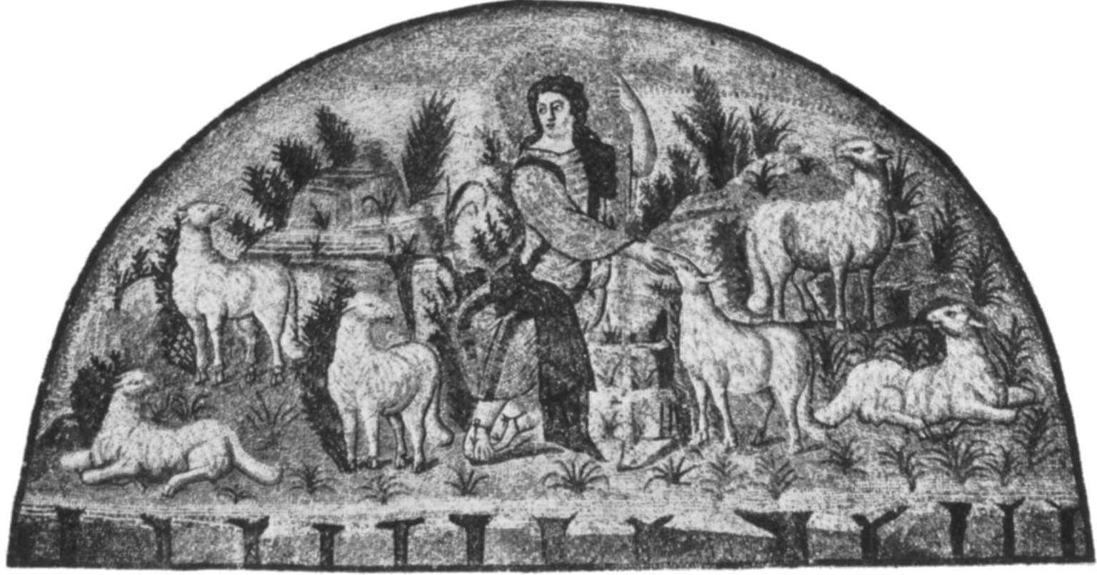 圖18 作為牧羊人的耶穌基督,普拉契狄亞陵寢(Mausoleum of GallaPlacidia)裡的鑲嵌圖案,意大利拉文納(424—451年)。引自Koemstedt,441,fig.50。