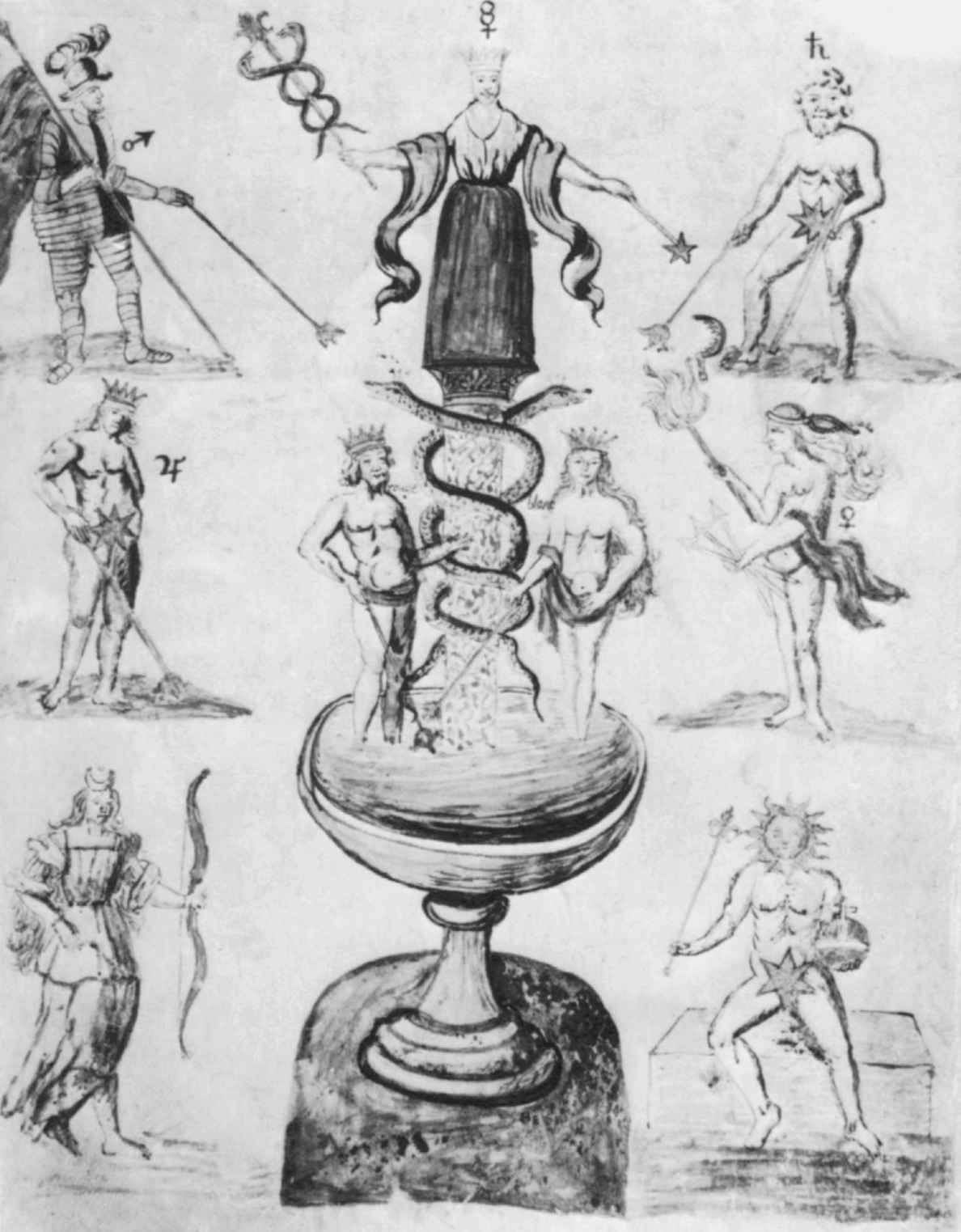 已經預見到“solificatio”的阿尼瑪,現在看起來像是靈魂指引者,那個指引道路的人[27](圖19)。這條路始於童年的土地,也就是說,當理性的現代意識還沒有和歷史的靈性,即集體無意識相分離的時候。這種分離確實是不可避免的,但它會使意識與人類啟蒙的模糊靈性產生疏離,並導致本能的喪失。這種結果就是本能的萎縮,人們也因此在日常情境中迷失了方向。但分離也伴隨以下情況,“童年的土地”必將保留著孩子氣,而且會成為幼稚傾向和衝動的永久根源。這些幹擾當然是意識心靈最不歡迎的,因此它始終壓抑它們。[28]但是,這種壓抑只能導致其與源頭更加疏離,從而使本能更加缺失,直到它變得缺失了靈魂。其結果,要麼意識心靈被完全淹沒在孩子氣之中,要麼經常不得不藉助於老年憤世嫉俗的虛偽或怨恨的辭職,而徒勞地防止自己被淹沒。因此,我們必須認識到,儘管意識取得了不可否認的成功,但在人類的很多方面,當代意識的理性態度存在幼稚的不適應性,而且對生活充滿了敵意。生活變得毫無生機、深受約束,且呼喚著要重新發現源頭。但是,只有意識心靈本身被領回到“童年的土地”上,在那裡像以前那樣接受無意識的指導,這個源頭才能被發現。過分長時間地維持童年狀態就是孩子氣,但是,起身離開並且假設童年不再存在,因為我們沒有看到它,這同樣也是孩子氣。但是,如果我們回到“童年的土地”上,我們就會屈服於害怕變得孩子氣,因為我們沒有認識到,原本有靈性的所有事物都具有兩面性,一張面孔向前看,另一張向後看。就像所有現實生活一樣,它是搖擺不定的,因而是象徵性的。