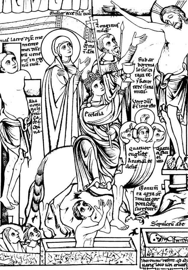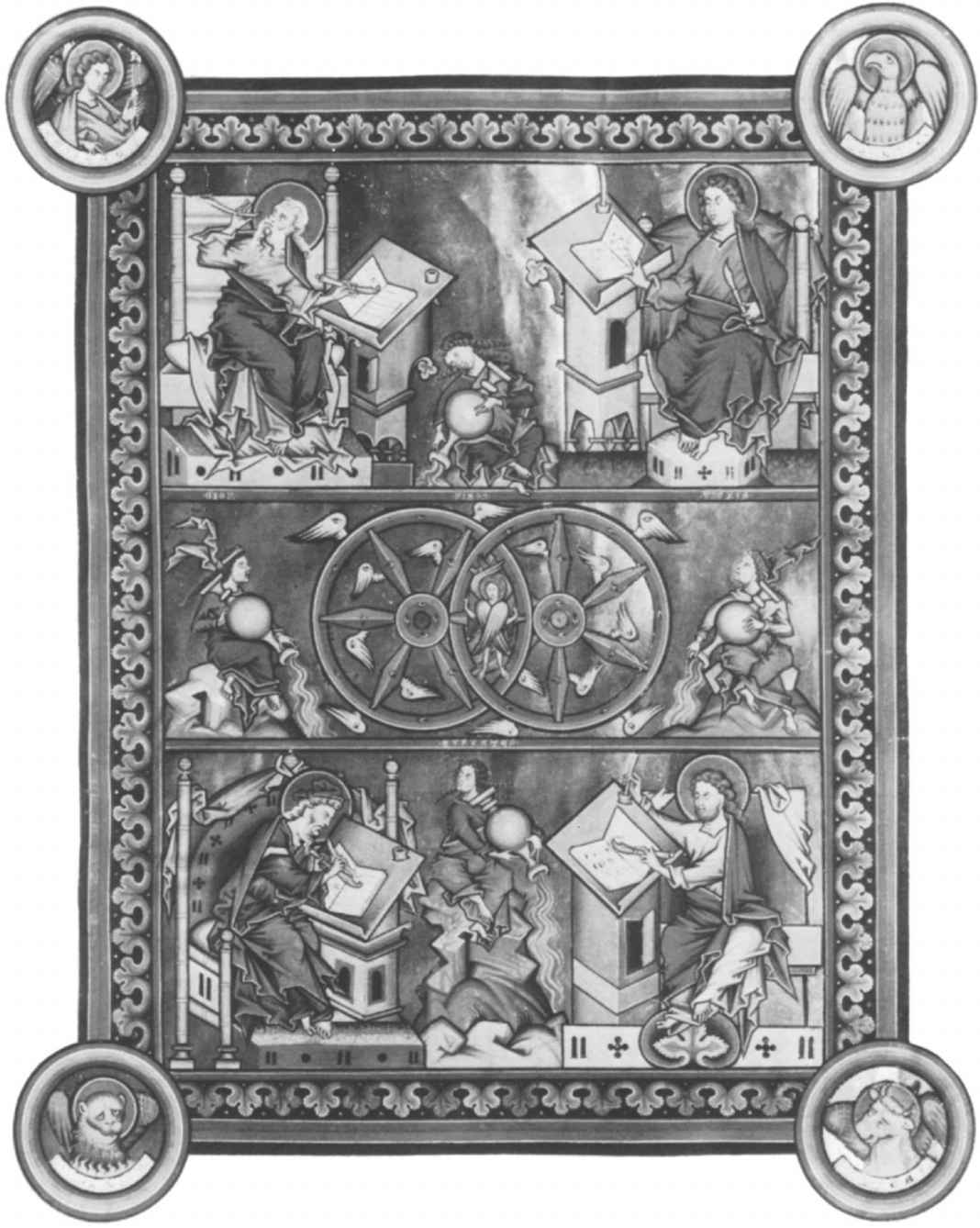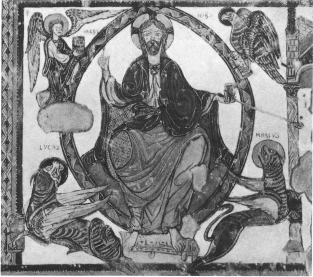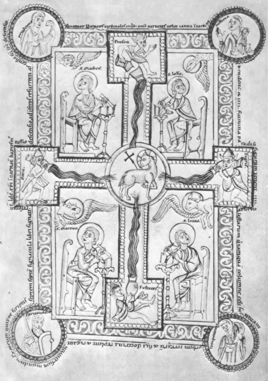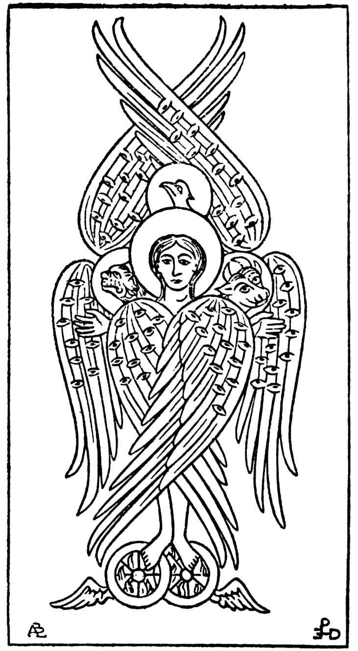 [222]參見來自埃及菲萊島的淺浮雕(Budge,347,I,p.3;Budge,345,plate5)。福音傳道者有時候會是三個長著動物頭,一個長著人頭。在一份公元7世紀的手稿中,確實記錄著福音傳道者戴著他們的動物頭,正如他們在那些羅馬石碑上的樣子。