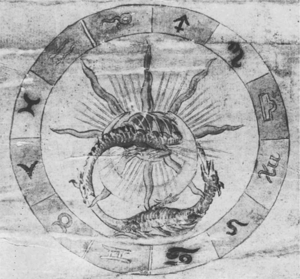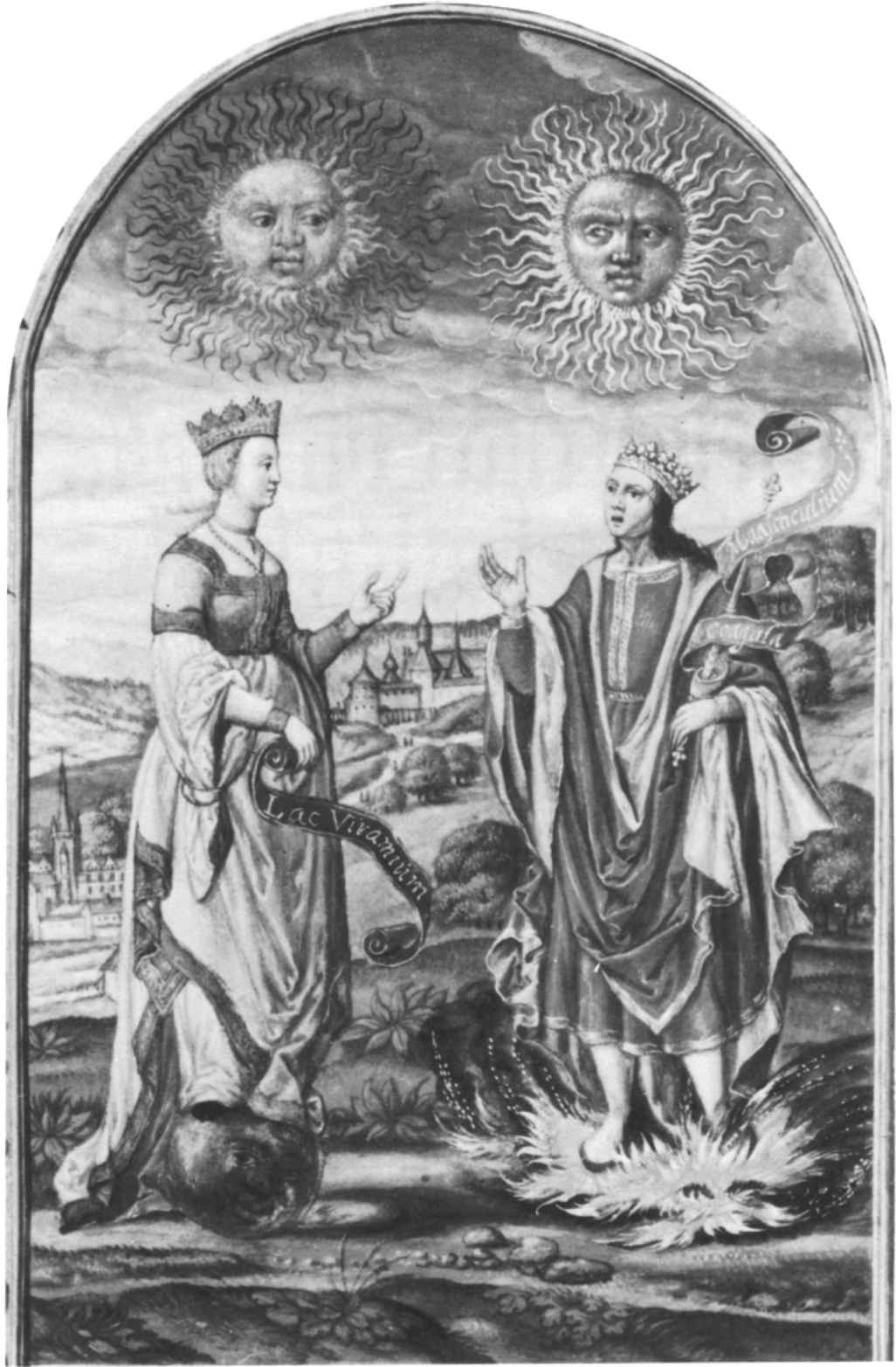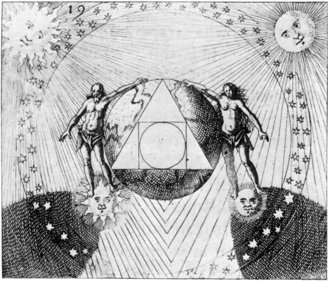 [148]鍊金術把這種綜合視為其主要任務之一。《哲人集》(493,p.26)中寫道:“因此把一個紅色奴隸的兒子與其芳香的妻子結合起來,把他們結合在一起,他們就會使這門藝術產生。”這種對立物的綜合常常是以兄弟姐妹亂倫為表徵的,這種說法無疑回到了“阿里斯萊的幻想”(“Visio Arislei”,2,iii)的第五篇章(參見圖167),該文描述了塔布裡提烏斯(Thabritius)和貝雅(Beya)的同居,他們是“大海之王”的孩子。
