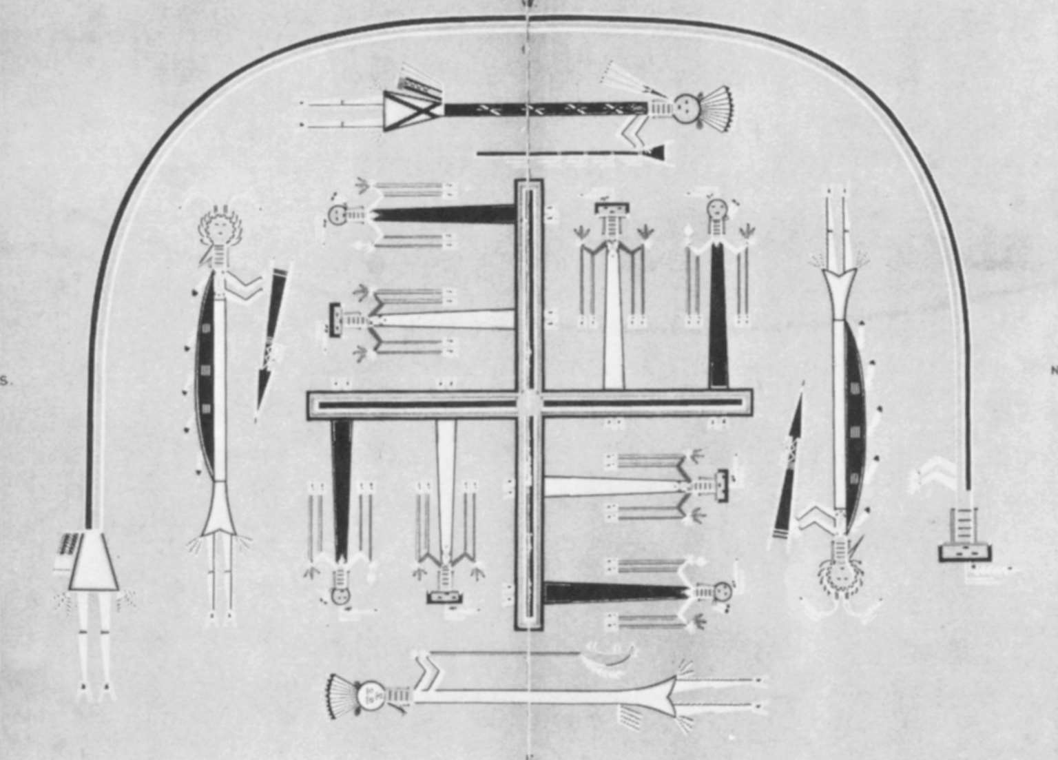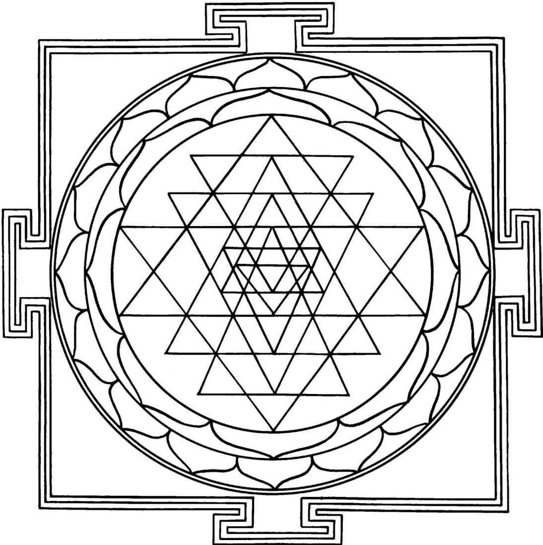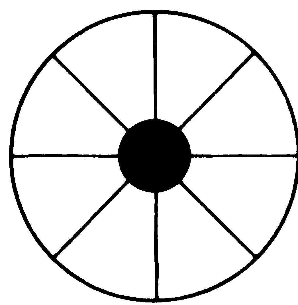 一個帶有符咒魔力的圓圈圖畫(圖13)是一種古老魔法的發明,凡是心中擁有某種特殊或隱秘目的人都會使用它。他以此來保護自己免遭“靈魂的危險”,這種危險會從外部對他產生威脅,任何一個心中懷有某種秘密的人都會受其攻擊。同樣的過程自古以來也一直被使用著,即畫出一個神聖不可侵犯的地方;例如,在建立一座城市的時候,他們首先畫出原始心靈特徵的軌跡[16]或最初的褶皺[17](參見圖31)。夢者把根植入中心這個事實,是對他想要從無意識中逃離這一幾乎無法克服的慾望的一種補償。在產生這種幻象之後,他體驗到了一種宜人的放鬆感——而且的確如此,因為他成功地建立了一個受保護的神聖圍地(temenos)[18],一個禁忌領域,他將能夠在那裡遇到無意識。以前那神秘可怕的隔離,現在對他來說卻已昇華為具有意義和意向的一種目標,這也進而消除了他的恐懼感。