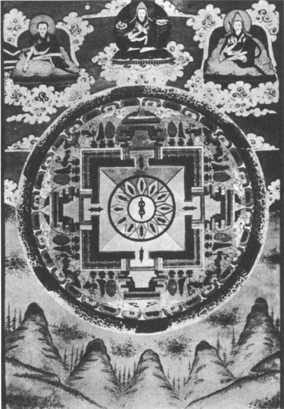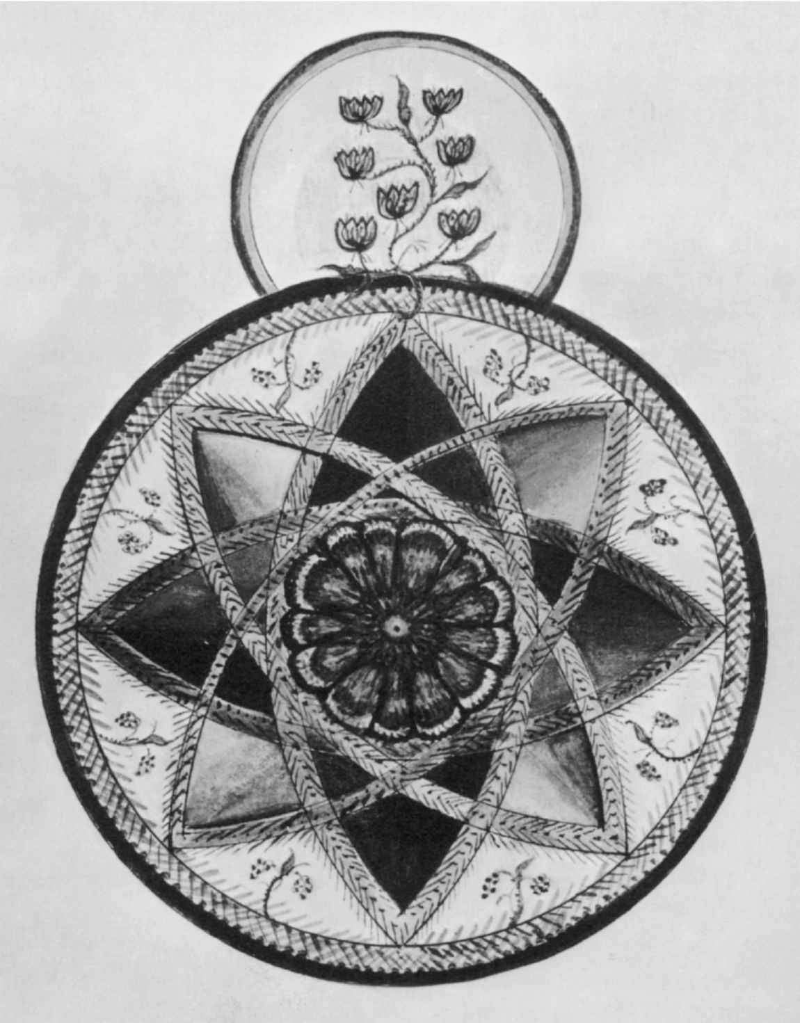 [207]“扭曲的”曼荼羅不止一次地出現。它們由偏離了圓形、正方形或正規十字形的所有形式組成,而且也是由那些並非以數字四而是以三或五為基礎的形式組成。數字六和十二是一些例外。十二可以建立在四或三的基礎上。十二個月或黃道十二宮是日常應用中具有明確象徵作用的循環。我們對建基於六的象徵循環也很熟悉。三表示觀念和意志佔支配地位(三位一體),而五則表示物質的人(物質主義)。